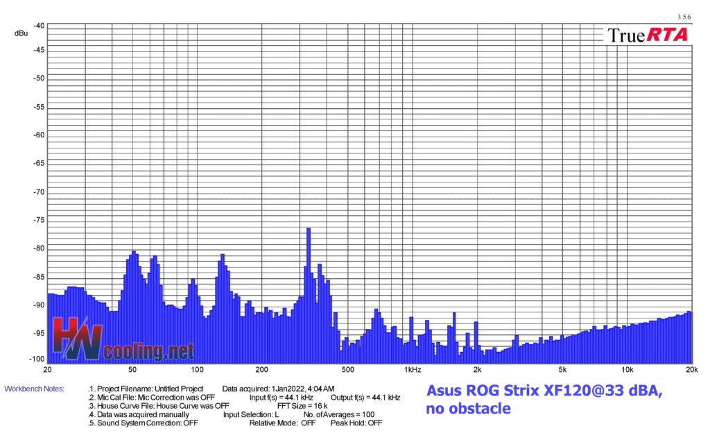 | Fan | Dominant sound freq. and noise level, no obstacle@33 dBA | NF-F12 PWM | NF-A15 PWM | ||||