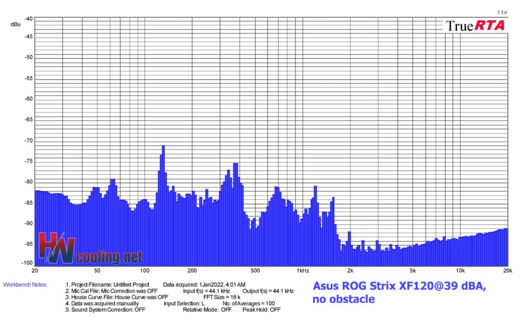 | Fan | Dominant sound freq. and noise level, no obstacle@39 dBA | NF-F12 PWM | NF-A15 PWM | ||||