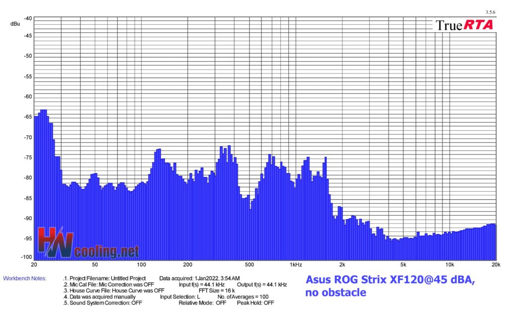 | Fan | Dominant sound freq. and noise level, no obstacle@45 dBA | NF-F12 PWM | NF-A15 PWM | ||||