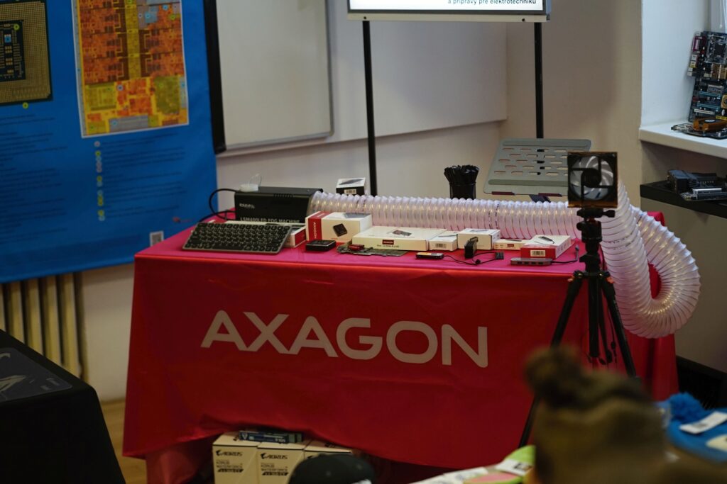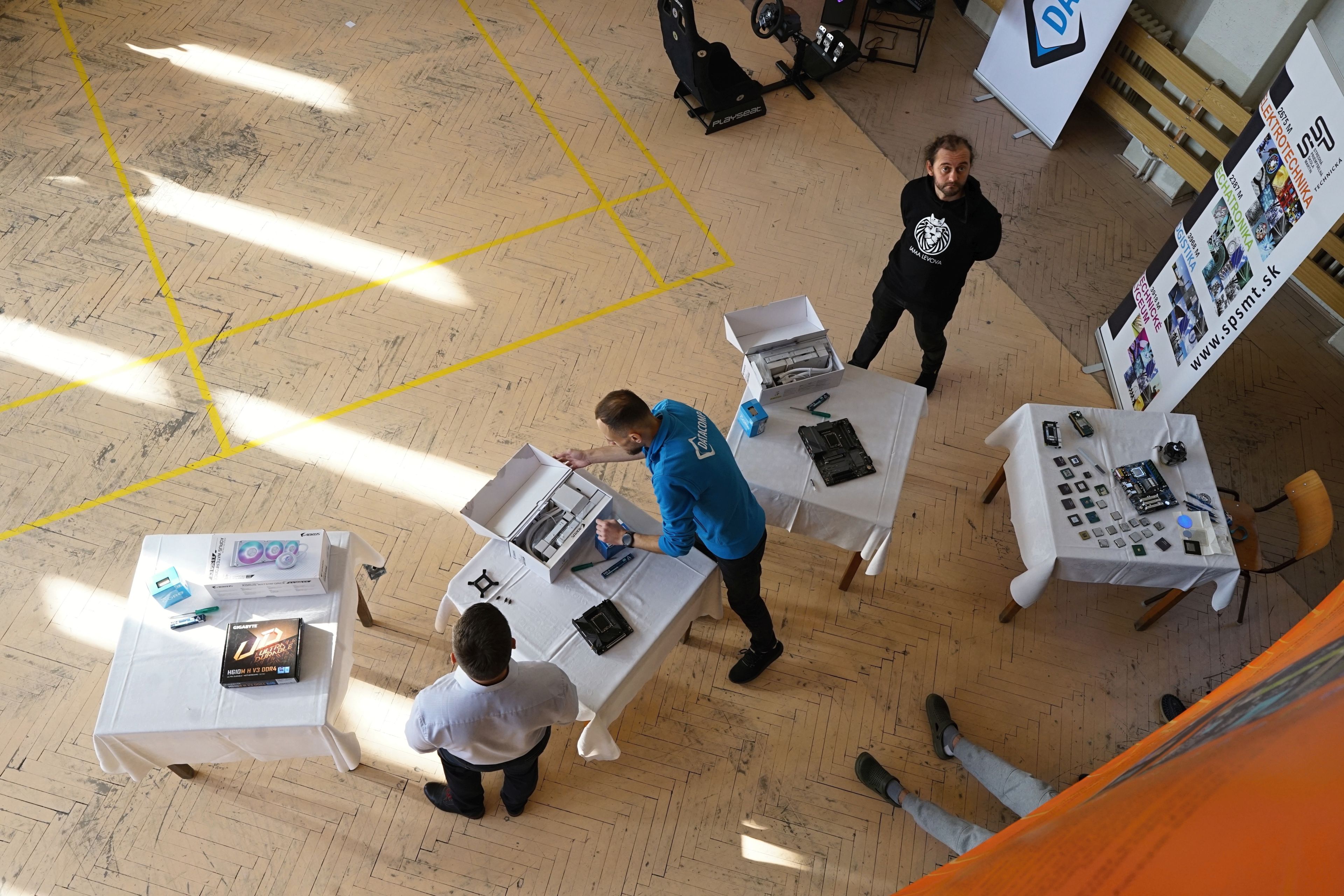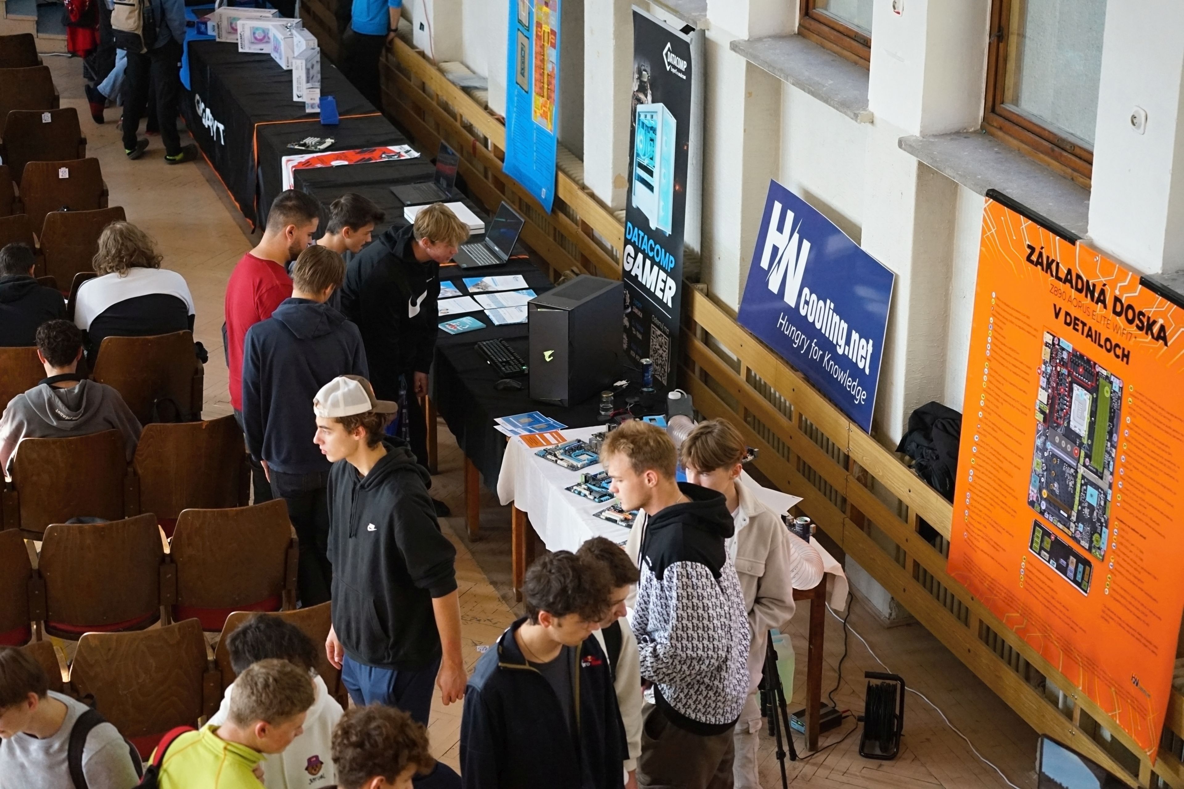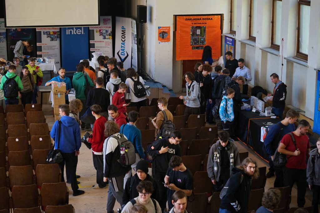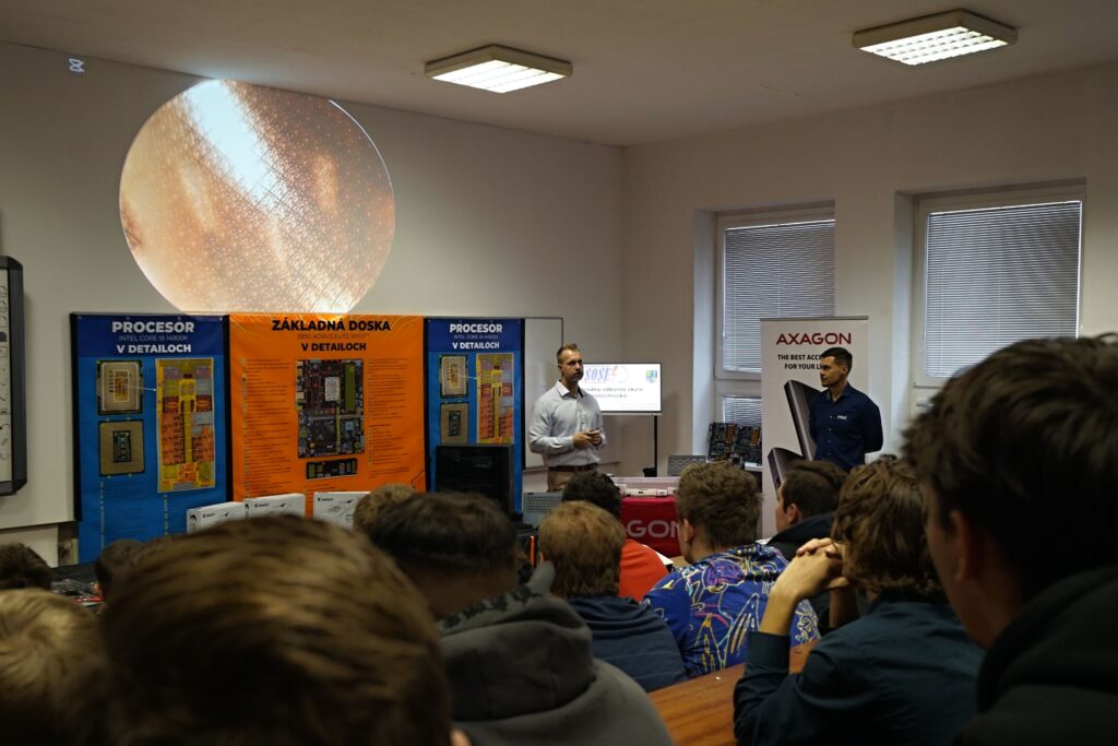 Na mieste sme, prirodzene, mali veľa produktov/PC komponentov, ktoré sú predmetom kúpy a predaja a áno, jednou z firiem bol aj obchod (Datacomp). Ale ten tam bol hlavne pre to, aby sme žiakov za ich preukázané vedomosti a zručnosti vedeli odmeniť hodnotnými cenami, z ktorých budú mať radosť. A ktoré v nich môžu rozhorieť ešte väčší oheň. Pre všetkých žiakov, to už ako magazín HWCooling, sme pripravili, vyrobili a dodali napríklad aj veľkoplošné plachty s detailným rozborom jednotlivých súčastí procesora a základnej dosky. To je niečo, čo na teoretickom aj praktickom vyučovaní chýba.