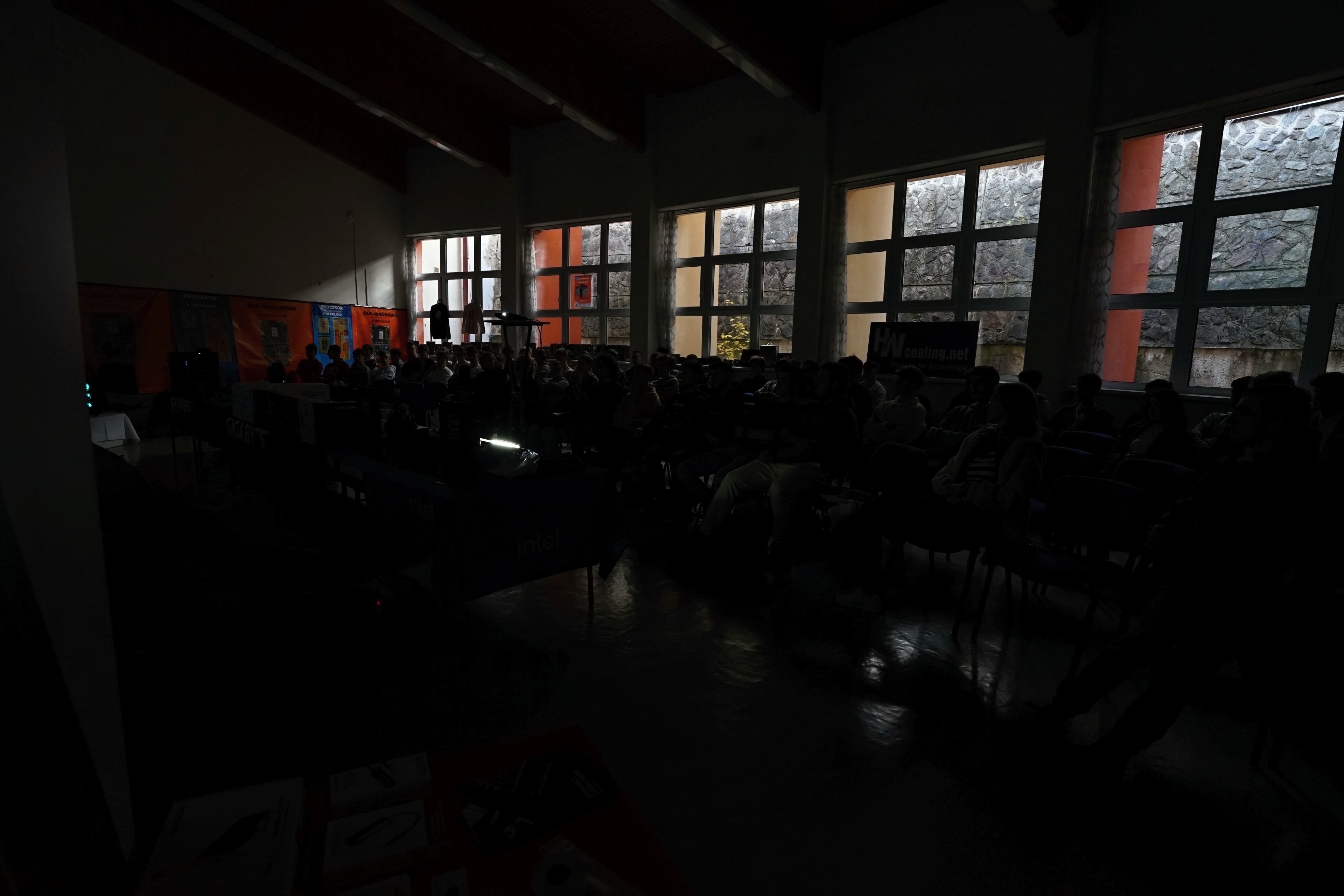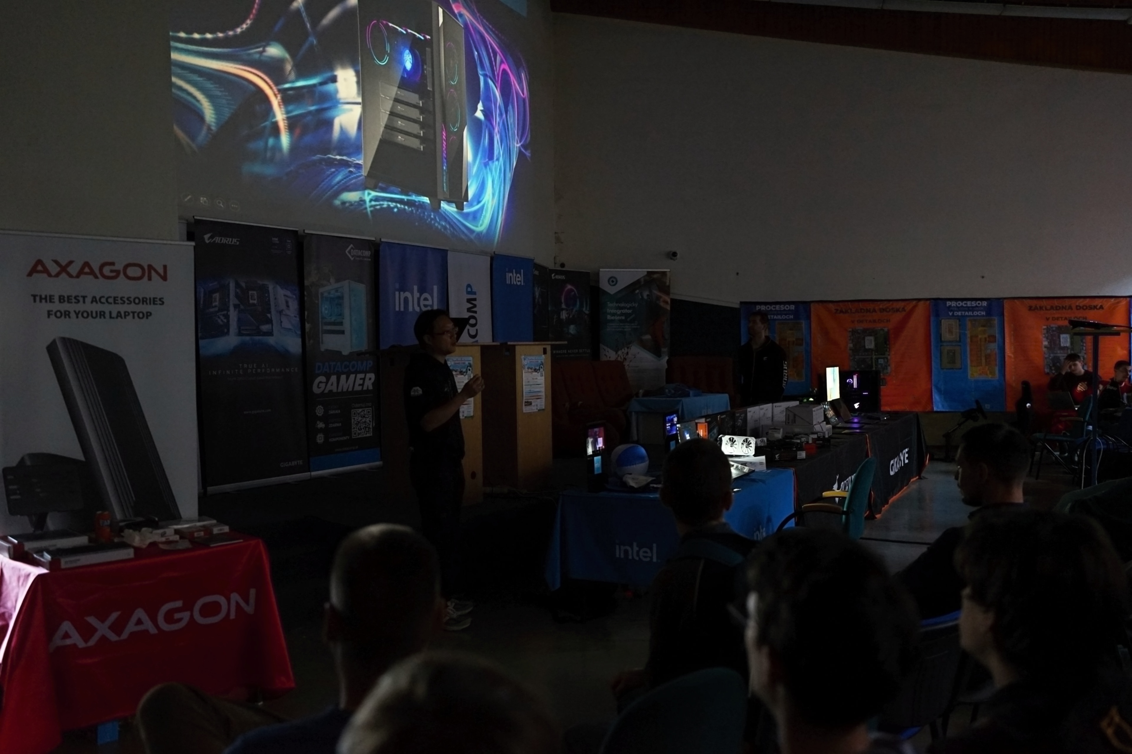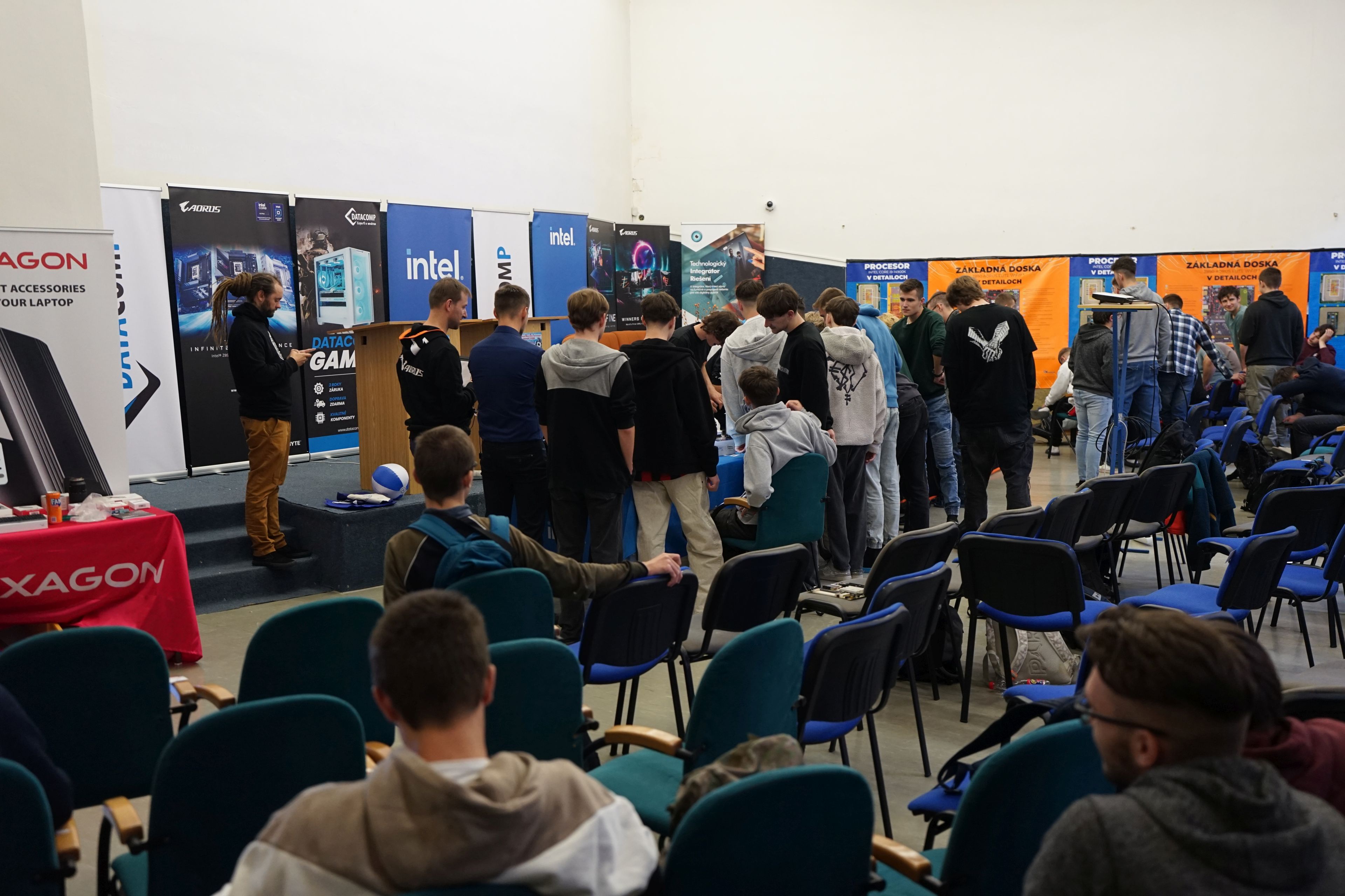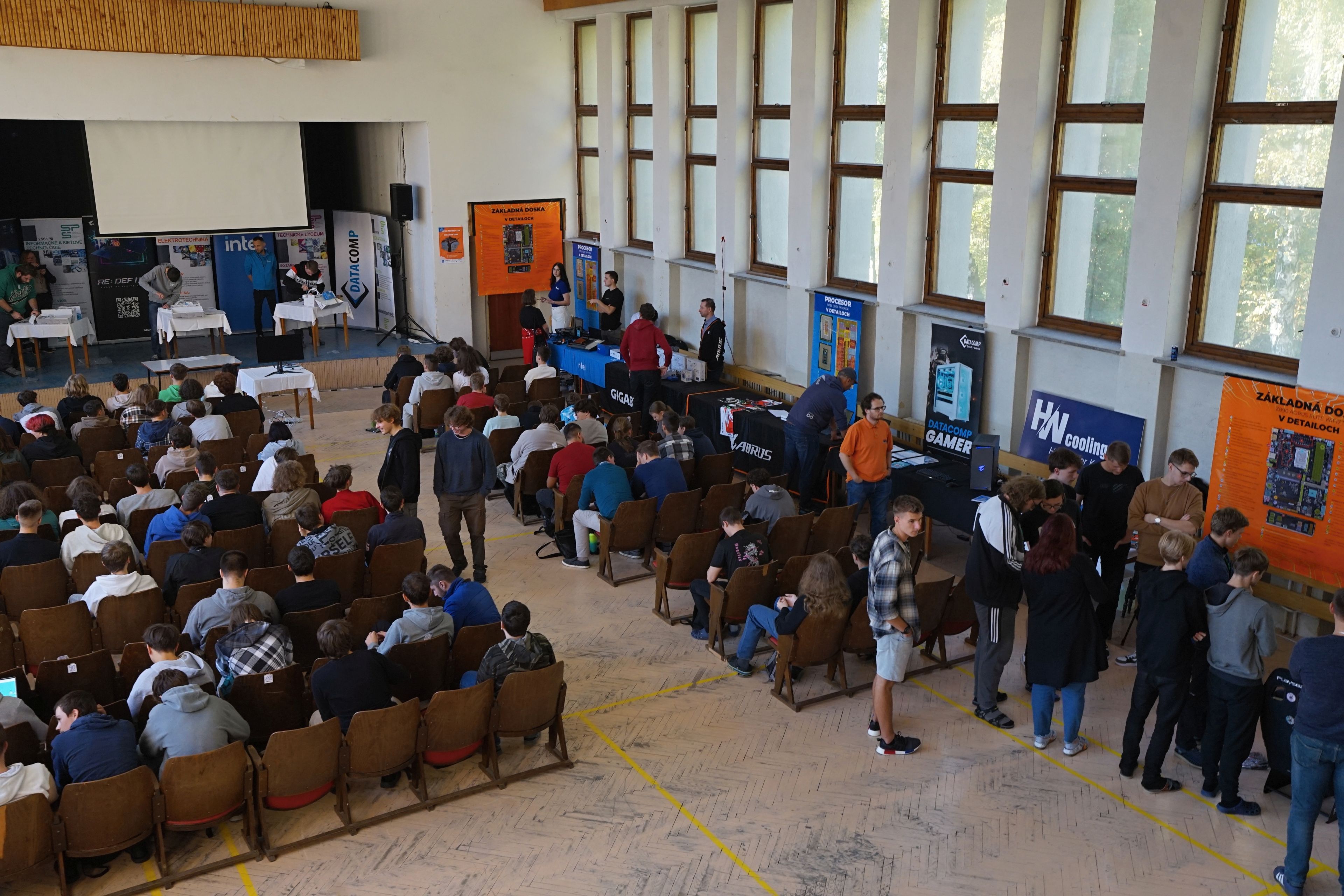 Na mieste sme, prirodzene, mali veľa produktov/PC komponentov, ktoré sú predmetom kúpy a predaja a áno, jednou z firiem bol aj obchod (Datacomp). Ale ten tam bol hlavne pre to, aby sme žiakov za ich preukázané vedomosti a zručnosti vedeli odmeniť hodnotnými cenami, z ktorých budú mať radosť. A ktoré v nich môžu rozhorieť ešte väčší oheň. Pre všetkých žiakov, to už ako magazín HWCooling, sme pripravili, vyrobili a dodali napríklad aj veľkoplošné plachty s detailným rozborom jednotlivých súčastí procesora a základnej dosky. To je niečo, čo na teoretickom aj praktickom vyučovaní chýba.