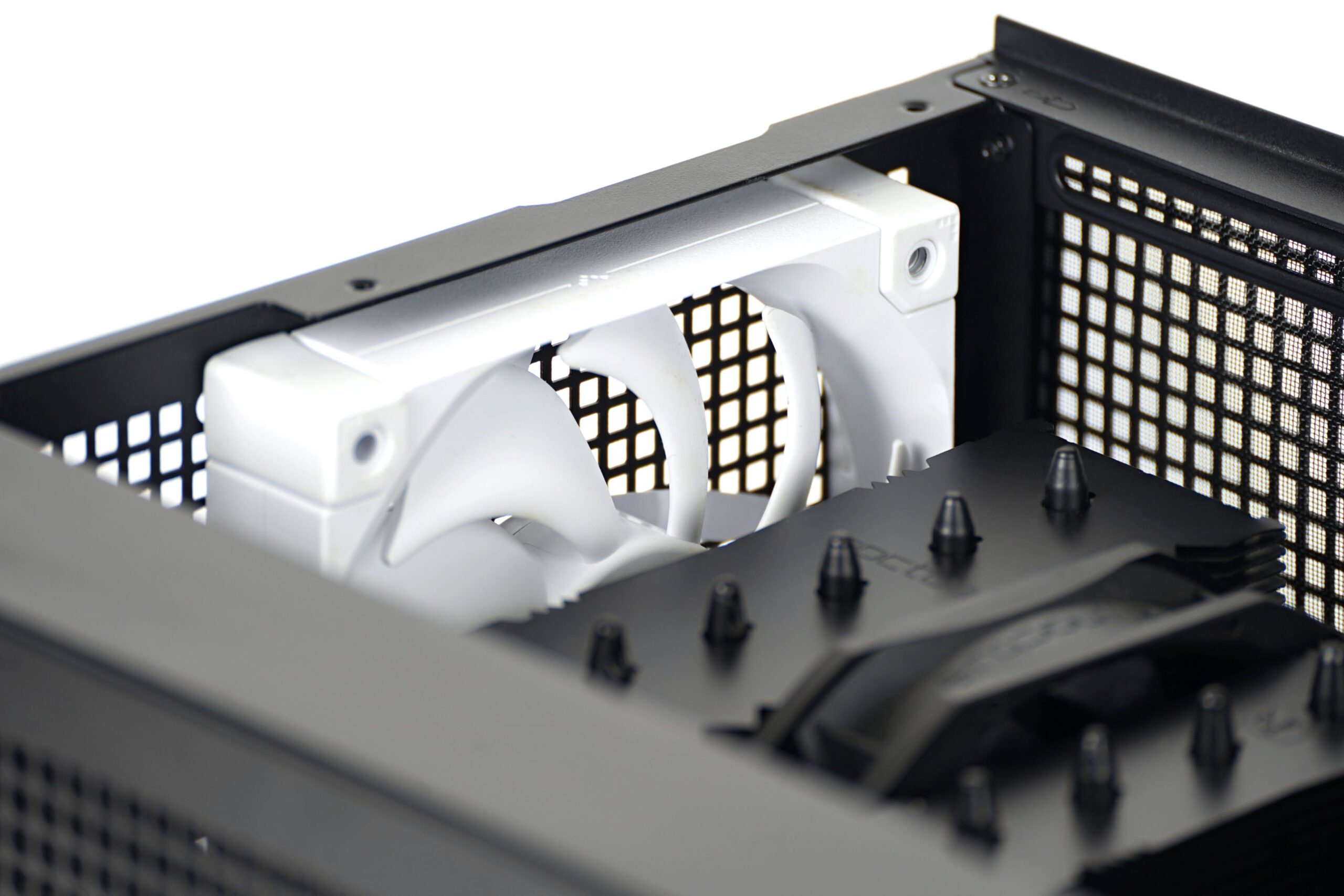Ako prvé sme do skrinky doplnili ventilátory. Konkrétne modely FT12, ktoré sme podrobne rozoberali aj v samostatnom teste. Jeden ventilátor prišiel dopredu (na vstup) a druhý dozadu (na výstup). Podporované ventilátory sú iba vo formáte 120 mm. Pozícii na ne sú štyri. Jedna vpredu, jedna vzadu a dve na strope.