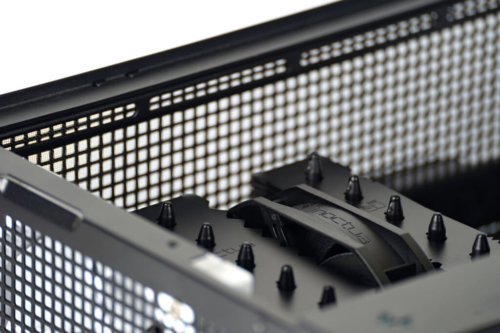 Chladič na procesor môže byť iba vežovitý (montáž radiátorov skrinka CH160 neumožňuje), a to do výšky 172 mm. Teda, oficiálne. V našom prípade je smerom k bočnici viditeľná rezerva, keď použitý chladič Noctua NH-D12L je nižší.