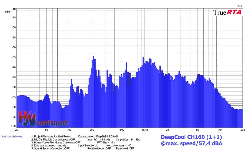 Ako je to so systémovými ventilátormi: Skrinku DeepCool CH160 testujeme v konfigurácii ventilátorov jedného vstupného k jednému výstupnému. Označovaná v grafoch je ako „1+1“, čo znamená jeden vstupný ventilátor k jednému výstupnému. Tým, že sú obidva regulované naraz, na rovnaký signál PWM, v skrinke panuje približne rovnovážne prúdenie.