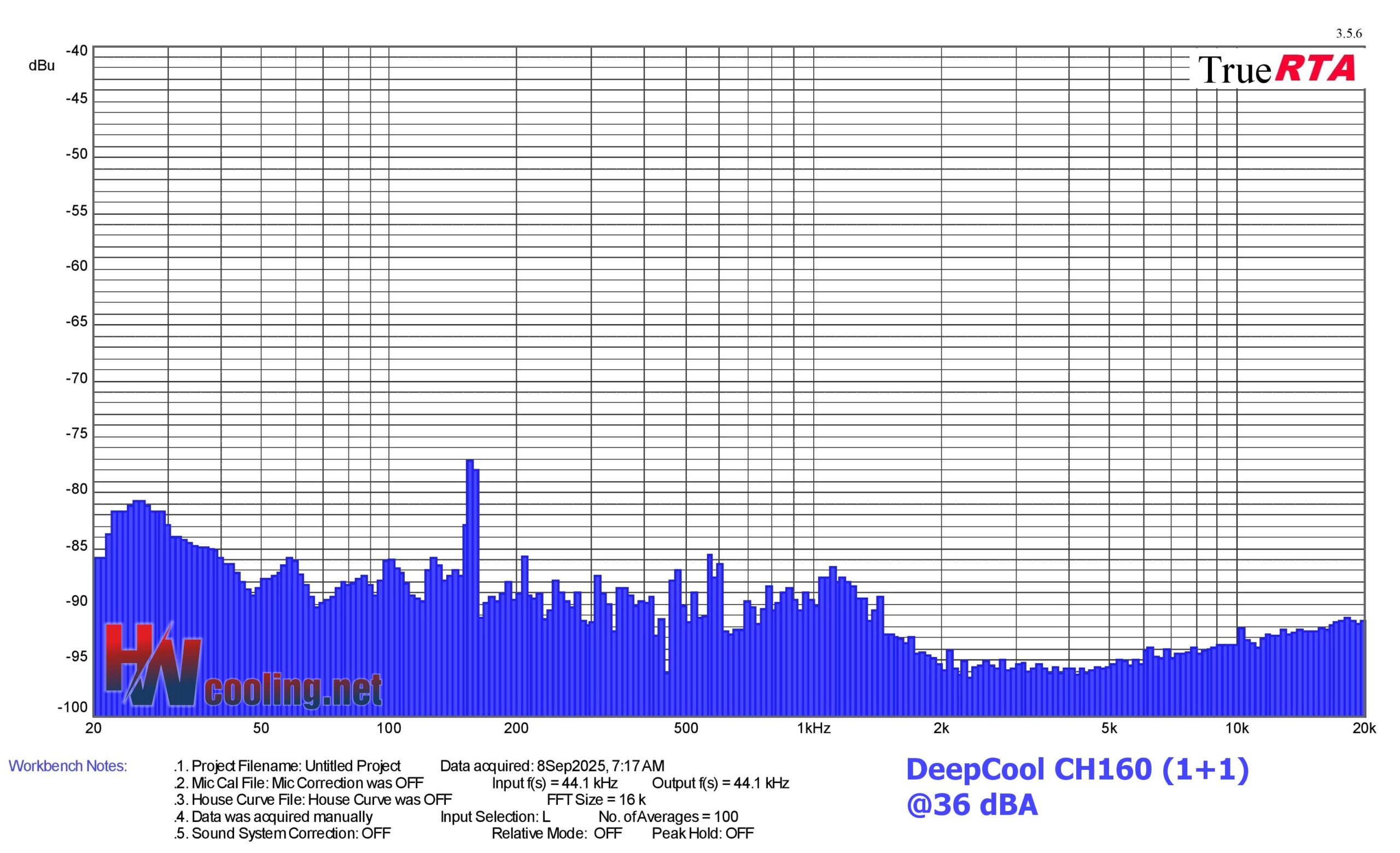 Ako je to so systémovými ventilátormi: Skrinku DeepCool CH160 testujeme v konfigurácii ventilátorov jedného vstupného k jednému výstupnému. Označovaná v grafoch je ako „1+1“, čo znamená jeden vstupný ventilátor k jednému výstupnému. Tým, že sú obidva regulované naraz, na rovnaký signál PWM, v skrinke panuje približne rovnovážne prúdenie.