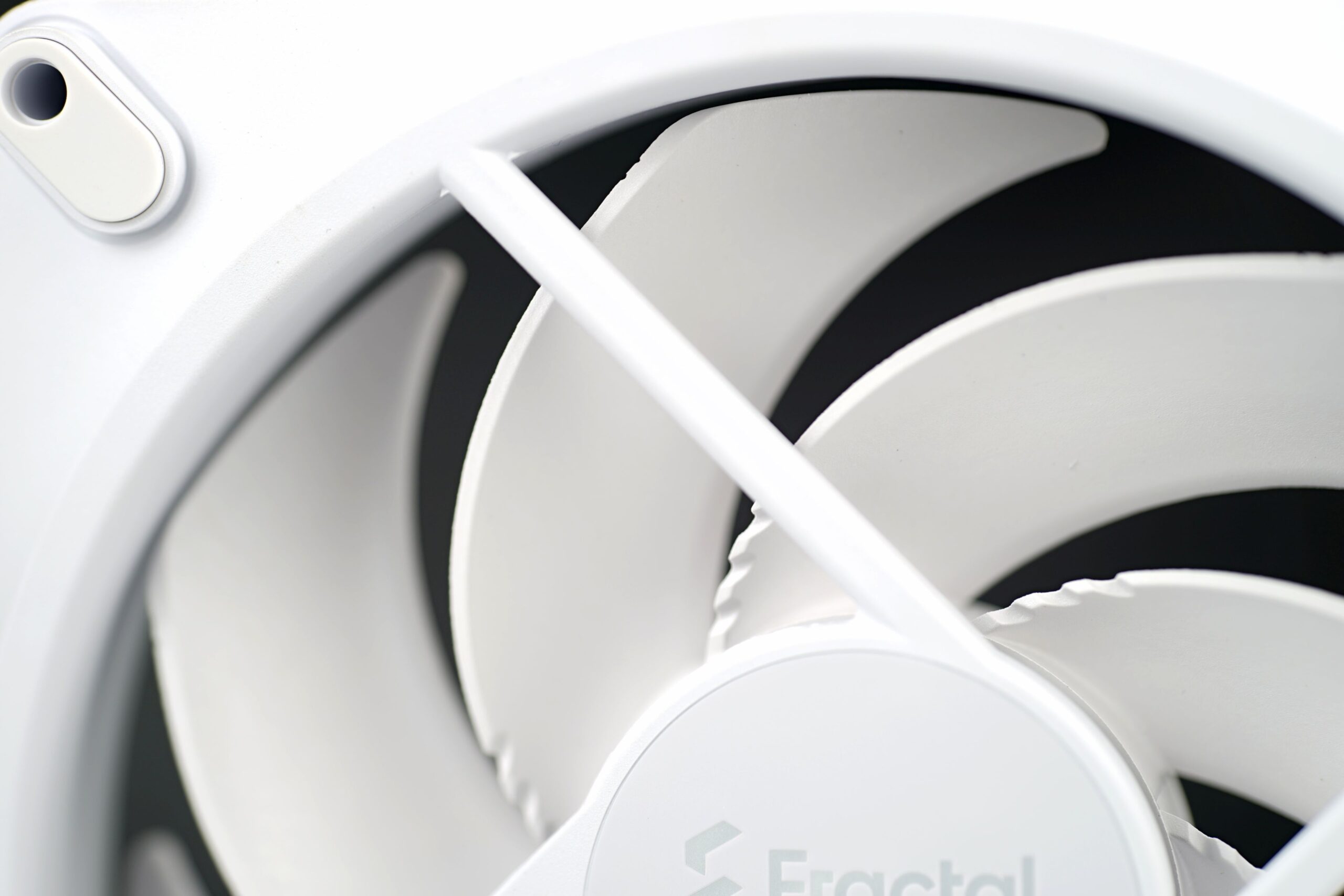 The curvature radius of the leading edges is quite aggressive. The impeller hub has a diameter of 46 mm, which can be considered average for 140 mm fans. The robustness of this component (the impeller hub) is important for stabilizing the impeller, and it also impacts factors such as fan lifespan. Speaking of lifespan or MTBF, we don’t have any official data. Unless we missed something, Fractal Design doesn’t specify this in its materials. However, we do know that the fans use fluid dynamic bearings (FDB). But even here, it’s hard to draw quality conclusions—not all fluid bearings are created equal, and their longevity depends greatly on design variations. All we can do is hope Fractal Design has put effort into this aspect as well.