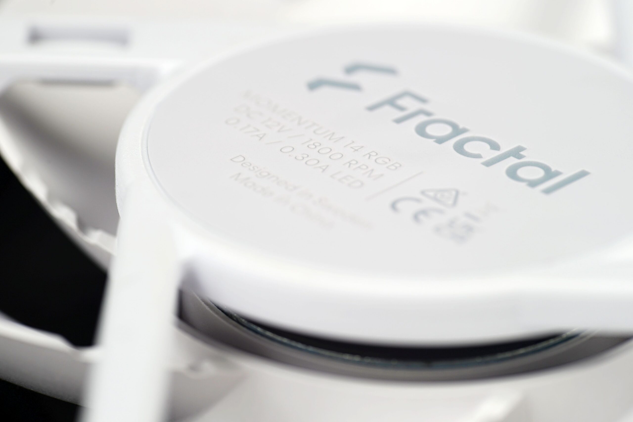 Compared to the “black” variant of the Momentum 12 RGB fan, the “white” Momentum 14 RGB reveals much more of the impeller even in darkness. This is rare for illuminated fans in general, and within the context of the Momentum 14 RGB, we’re also dealing with liquid crystal polymers—a true rarity. Illuminated fans with LCP impellers are virtually unheard of, but the Momentum 14 RGB (White) does have them, and we can already say that this was a smart move by Fractal Design. Building the new fans (replacing the Aspect line) not just on efficient aerodynamic design but also on LCP results in truly impressive outcomes, as you already know from tests of the smaller variants (Momentum 12/RGB). This analysis, however, focuses on the 140 mm Momentum 14 RGB models in white – impeller and frame alike.
