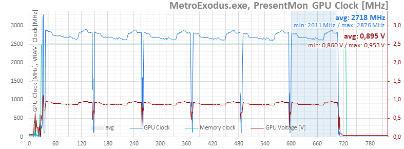 The GPU clock frequency ranges from 2,611 to 2,876 MHz, averaging 2,718 MHz.