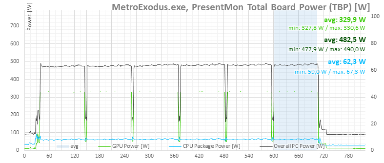 According to HWiNFO monitoring, the card’s average power draw once again hits the 330 W limit, while the PC’s total average power draw is 482.5 W.
