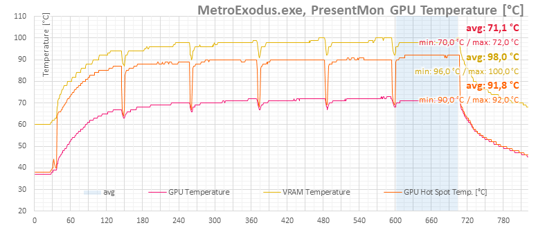 Temperatures in Silent mode are only slightly higher for both the GPU and memory. The GPU’s average peak temperature reached 72 °C, while the memory fared a bit worse at 100 °C, with the hotspot at 92 °C.