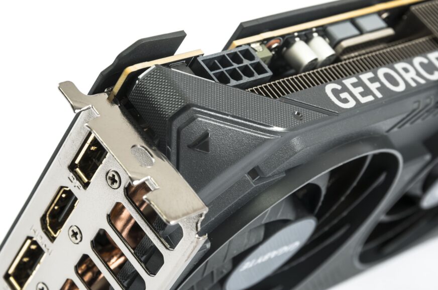 The back of the Gigabyte packaging highlights company technologies used by the card. First and foremost is the attractive design featuring Windforce cooling with a new generation of fans, a heatsink with composite heatpipes, and a large copper base that cools both the GPU and memory. The card’s construction is reinforced by a bracket that is screwed directly into the backplate—though, unfortunately, it’s made entirely of plastic. A large cutout in the rear half of the card allows warm air from the heatsink fins to exhaust freely above the card.