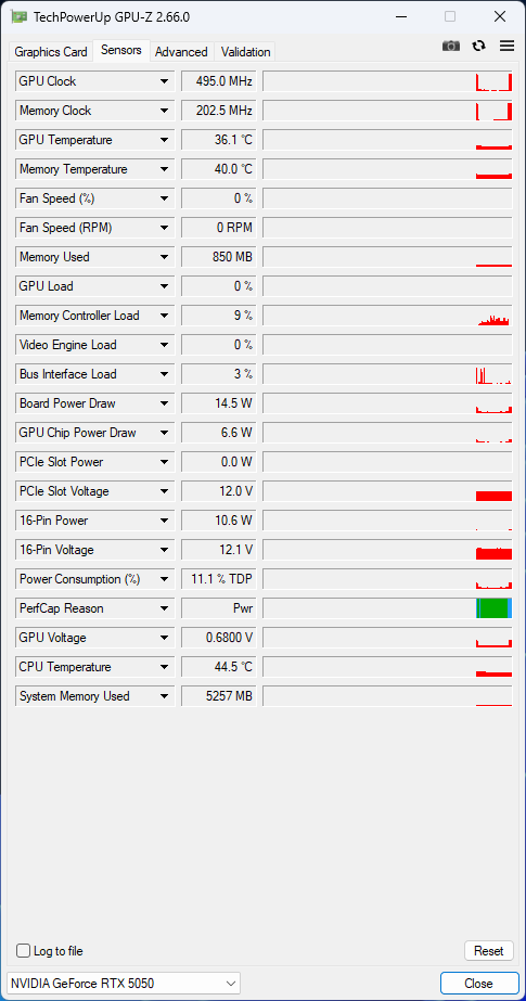 Unlike the more powerful next-generation GeForce models, the RTX 5050 uses older GDDR6 memory. This results in lower effective clock speeds and overall memory bandwidth, even with the same bus width. At 20 Gb/s over a 128-bit bus, the card offers a bandwidth of 320 GB/s. The pricier RTX 5060 performs noticeably better with 448 GB/s.