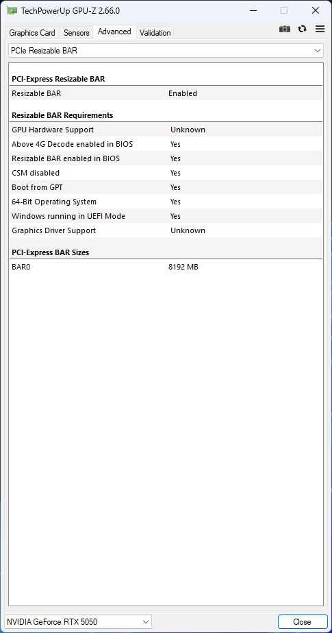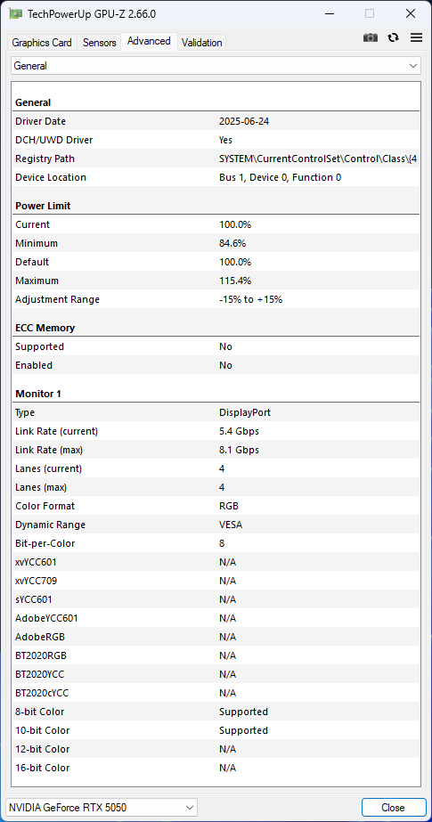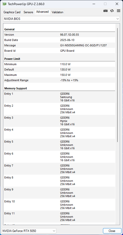 The Gigabyte GeForce RTX 5050 Gaming OC has a factory-overclocked typical boost clock increased from the reference 2572 MHz to 2632 MHz. The power limit remains at the reference 130 W but can be lowered by 15% to 110 W or increased by 15% to 150 W. GPU-Z does not yet fully support the RTX 5050, so some values are missing.