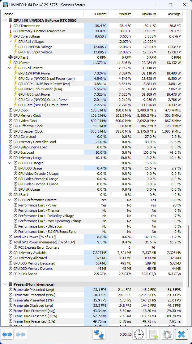 HWiNFO reads significantly more data from the card’s monitoring sensors than GPU-Z. The sensors available in the current version can be seen in the screenshot below.