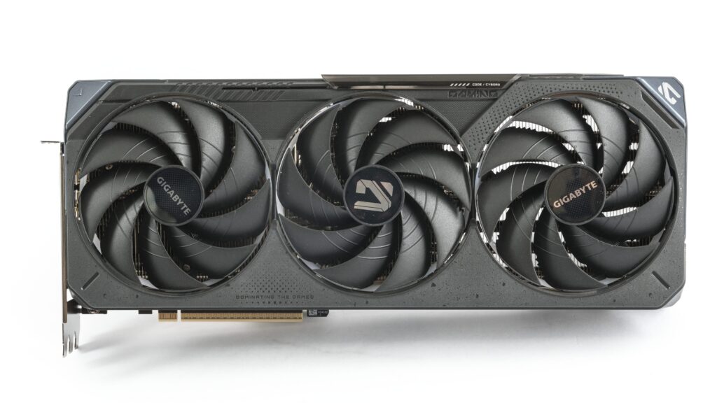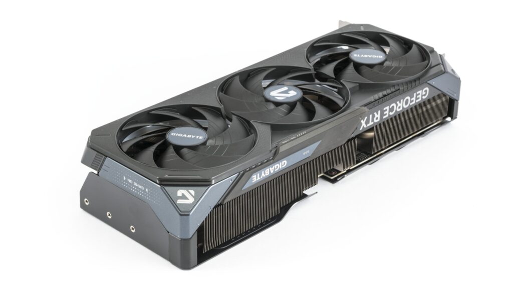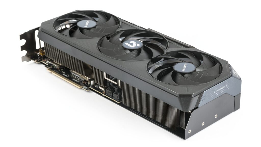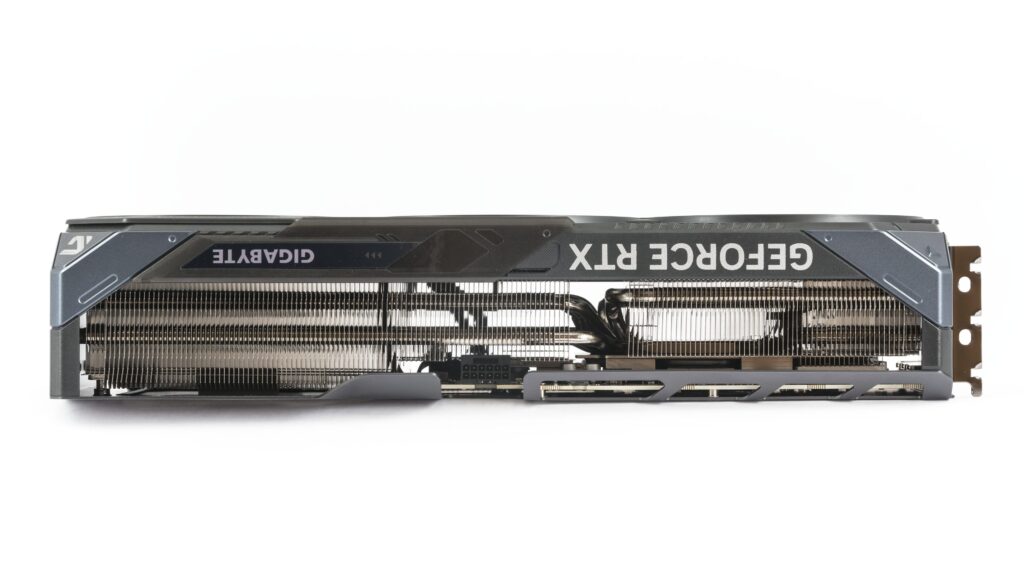 The tall heatsink, which is cooled from above by three large fans, deserves praise. The shroud itself is made of plastic, featuring a black and dark metallic gray glossy finish with translucent elements. The heatsink fins are arranged transversely, meaning a significant portion of the heated air is expelled through the open side. Despite weighing almost two kilograms, the card isn’t particularly robust, so handling it with extra care is advisable.