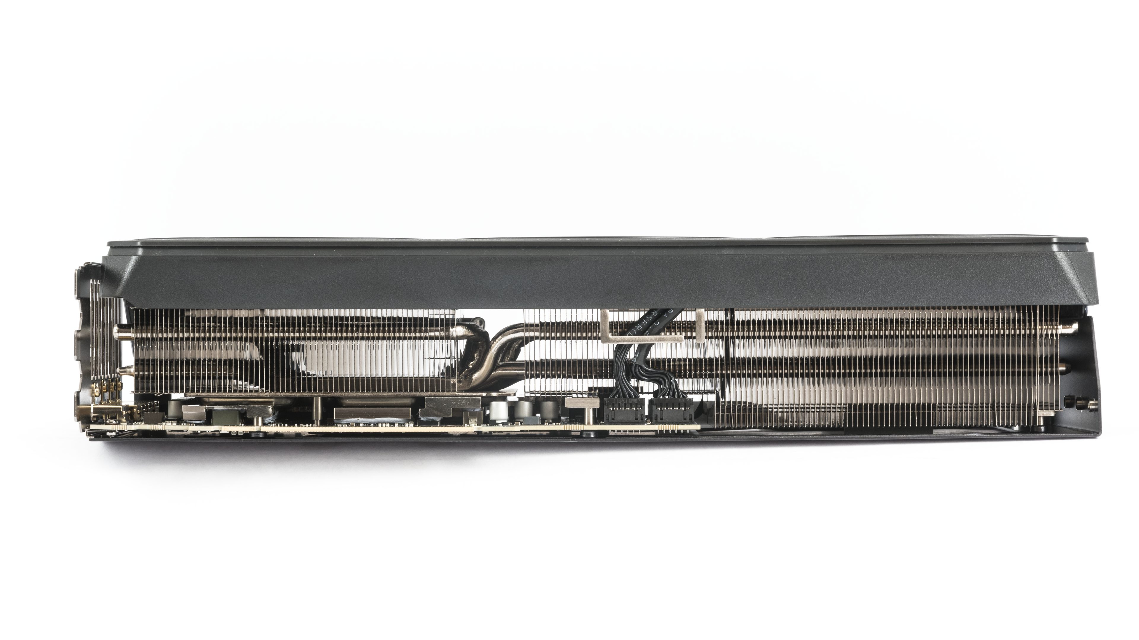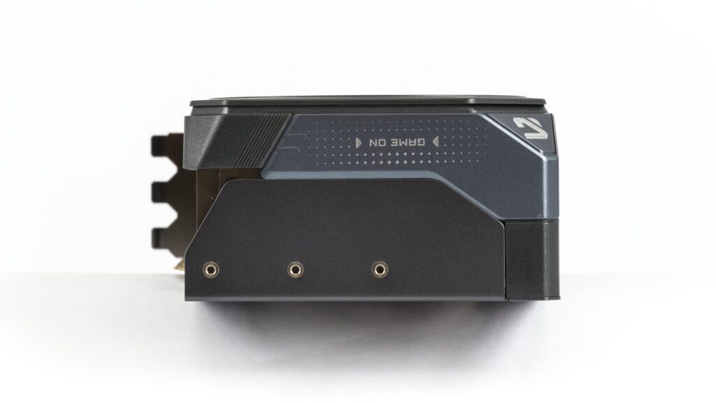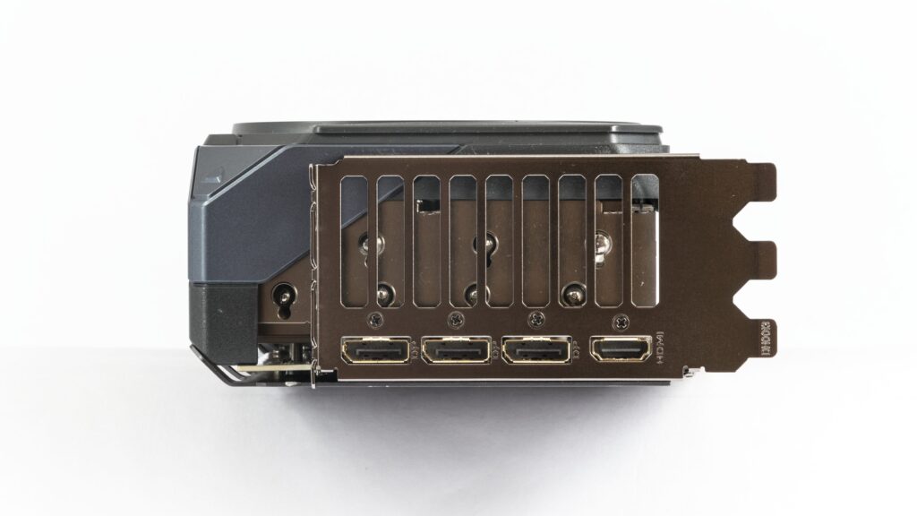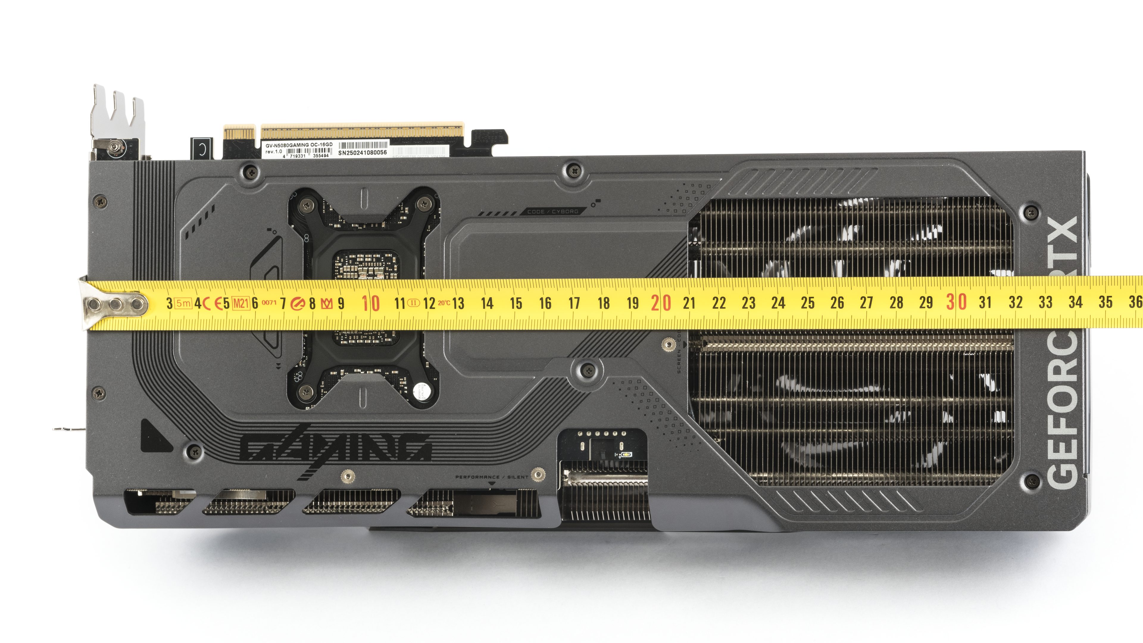 The card’s length exceeds 34 cm by a few millimeters. This could be a problem for some cases, as many have been getting smaller in recent years. It exceeds the edge of the bracket by about 3.5 cm, which is typical for cards with similarly large fans. In terms of height, it measures 7 cm – about three and a half slots.