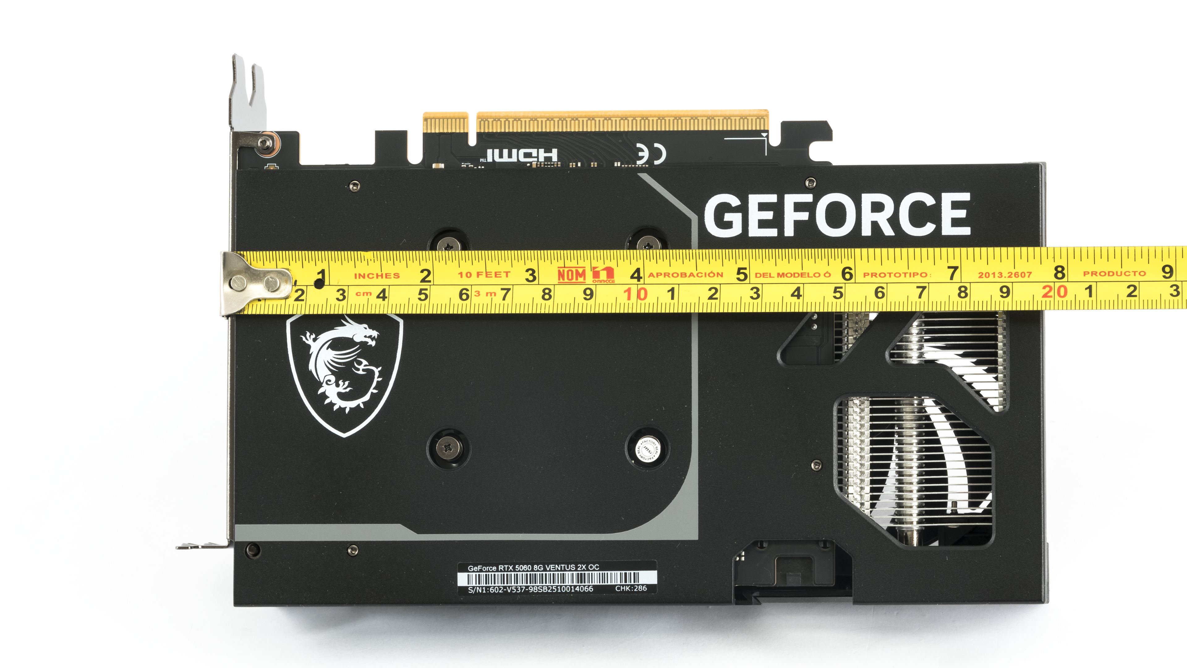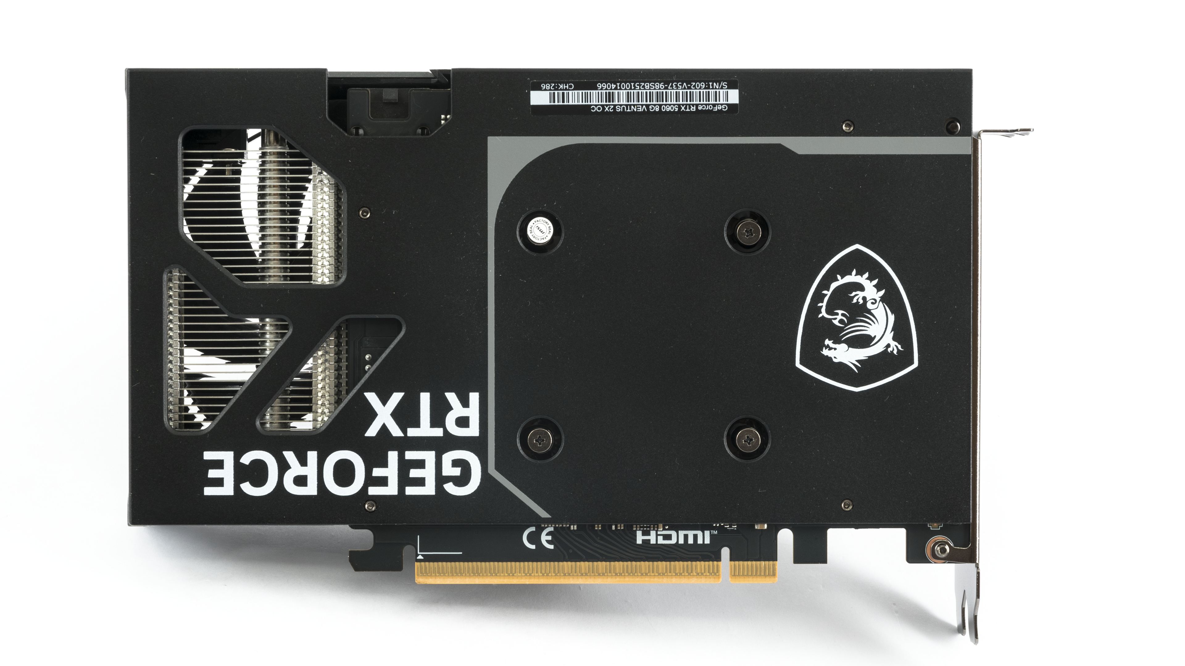 The Ventus 2X OC model with 8 GB of memory is the most affordable GeForce RTX 5060 variant from MSI. It features a compact dual-slot cooler with a length of 20 cm, making it suitable even for small-form-factor cases. The cooler is slightly louder than average due to overly high fan speeds, but it has sufficient headroom for manual fan speed reduction. But with 8 GB of memory, compromises are necessary in the most demanding games.