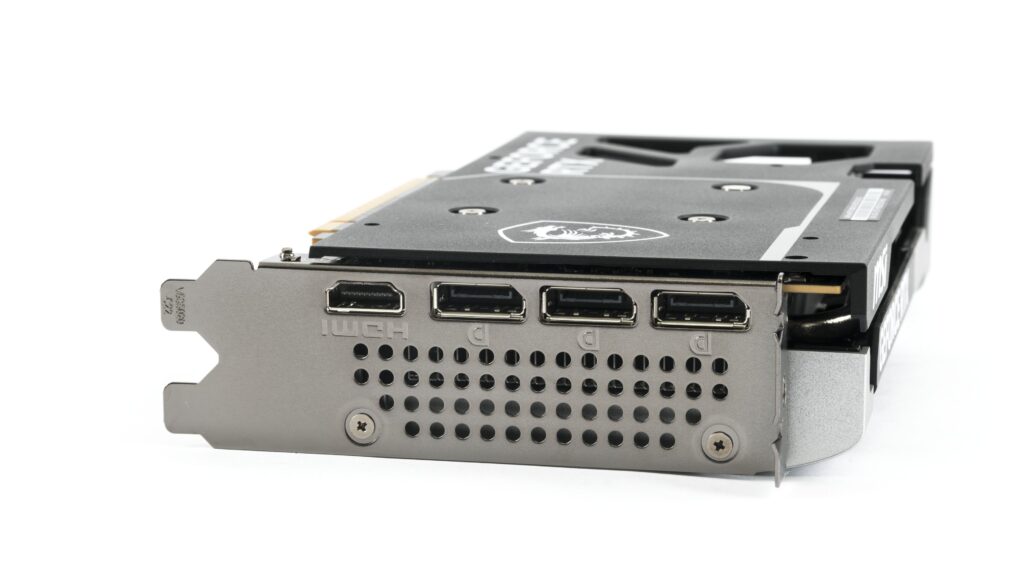 The bracket follows the most commonly used output configuration on GeForce cards—three DisplayPort 2.1b connectors with UHBR20 and one HDMI 2.1b.