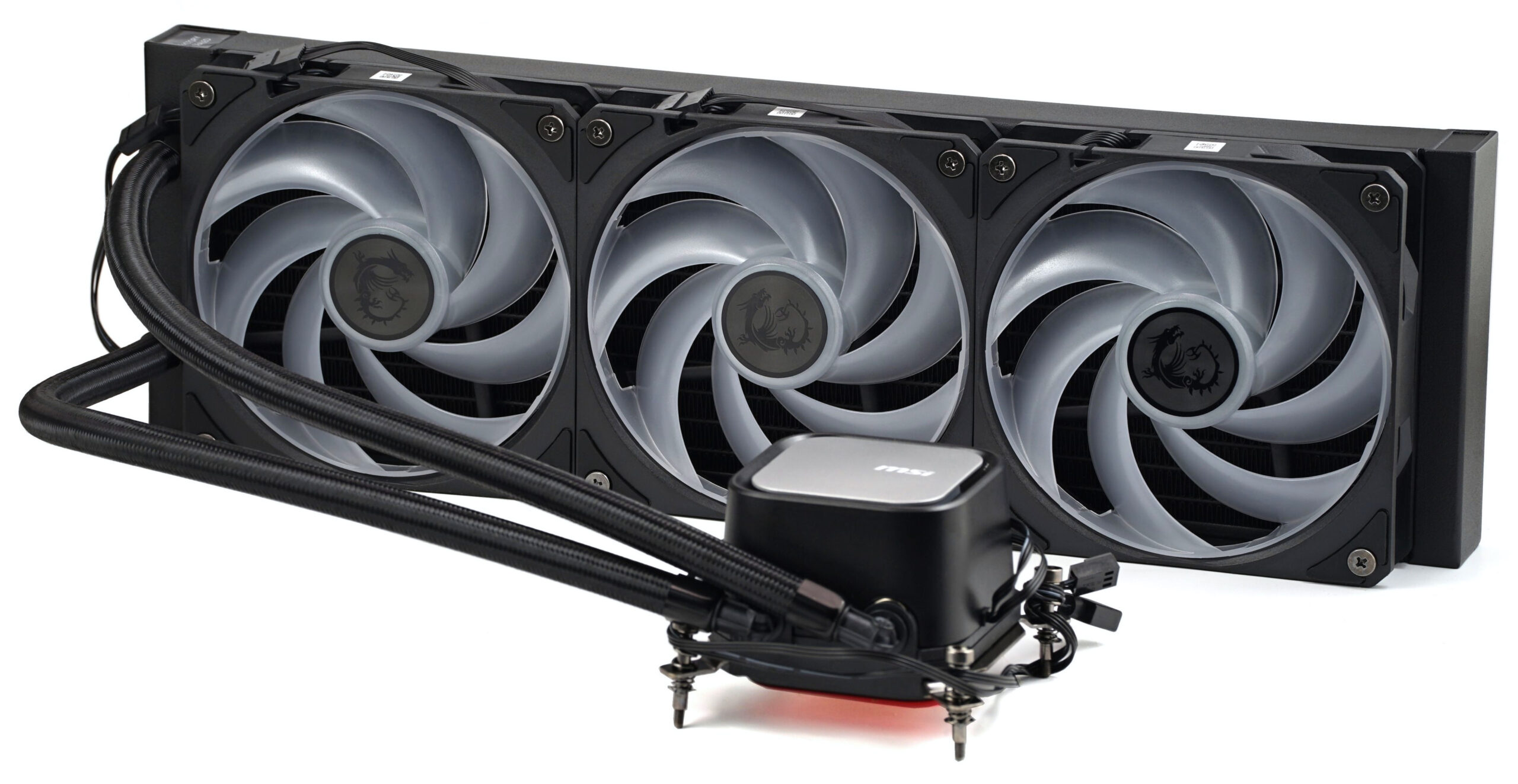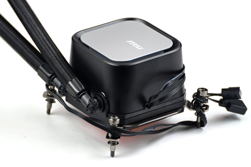 The pump is integrated into the block, which also features illuminated ARGB LED elements on the top—both the MSI logo and the perimeter edge are lit via light guides. As a result, the CoreLiquid A13 360 lights up quite a lot across different spots. If that’s what you want, you just need to hook up the block lighting. For synchronization with the fans, you can simply daisy-chain the ARGB LED connectors. The pump lighting can be linked to the fan lighting, running together from a single 3-pin ARGB header on the motherboard.