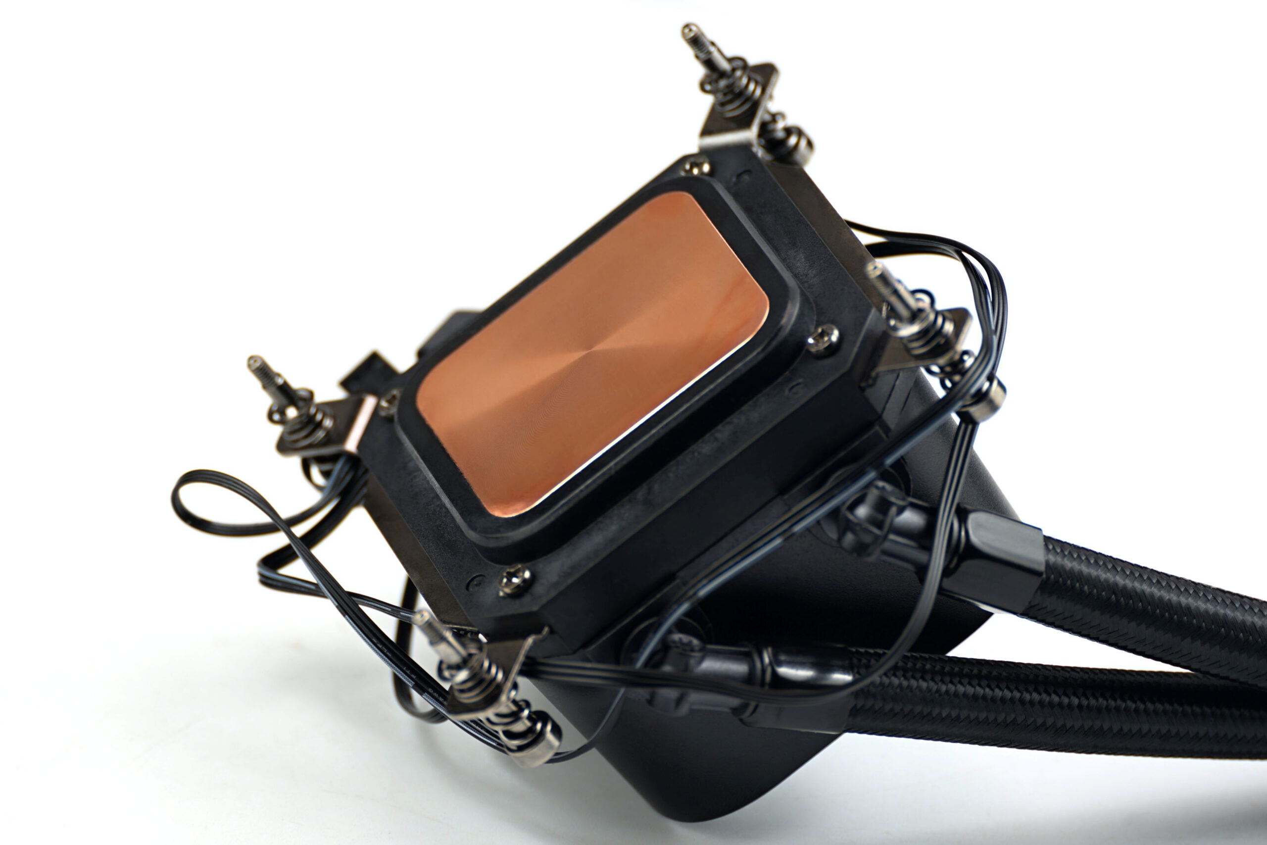 The construction basics match what you’d expect from other liquid coolers in this price bracket. The 360 mm radiator is aluminum, cooled by three 120 mm fans. The tubes are sleeved with textile braid, and the block side features swivel joints for easier installation on the motherboard. No issues here. The tube length (about 400 mm) is also sufficient to reach the CPU from the front position in larger PC cases.