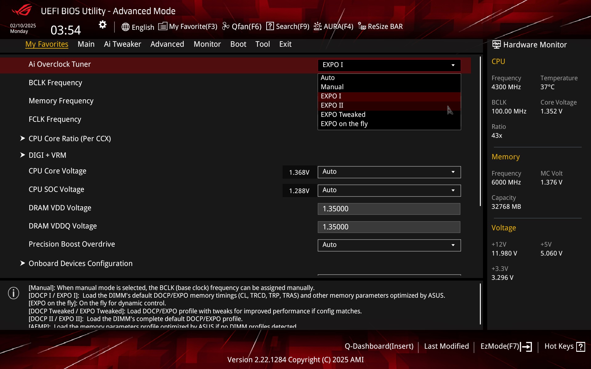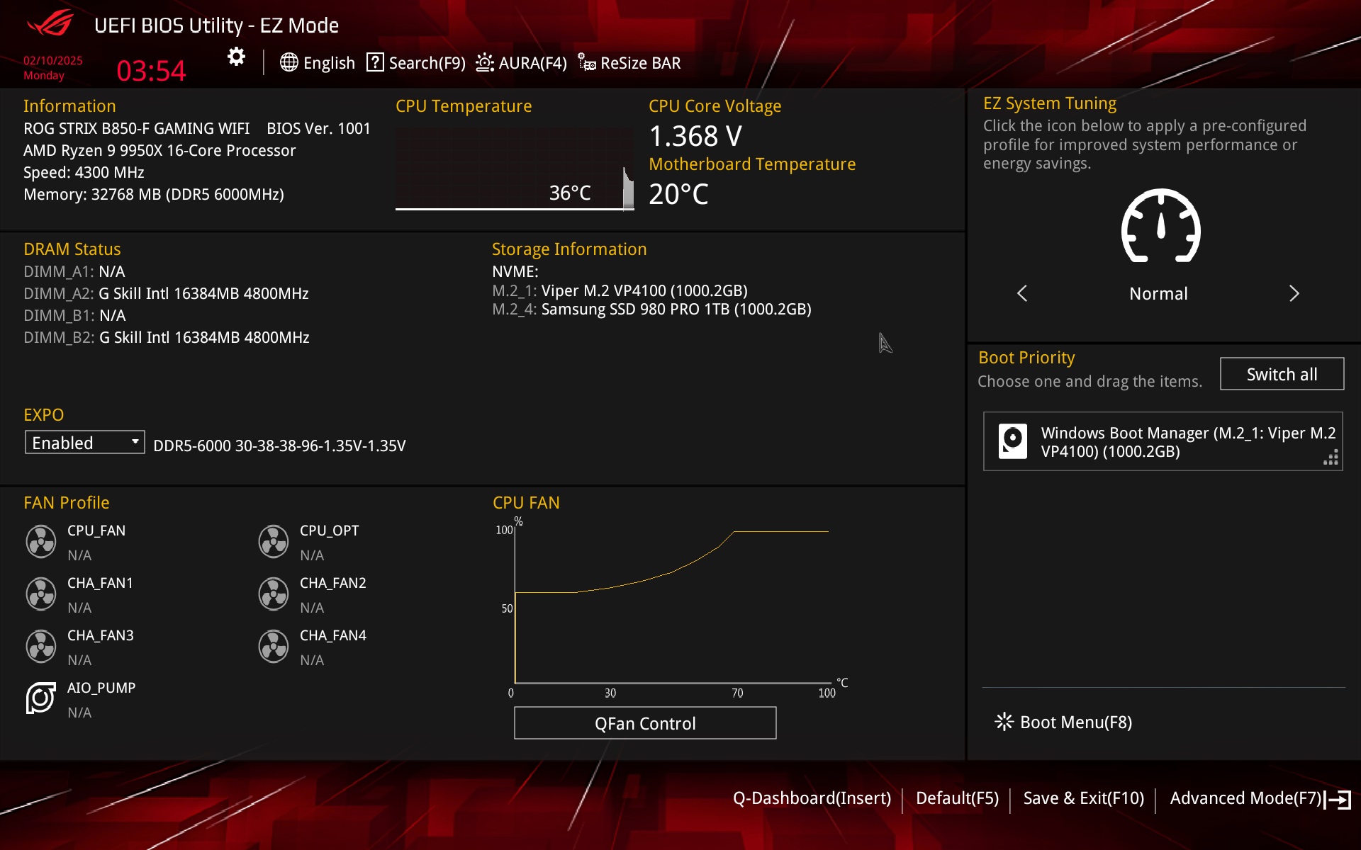 The EZ Mode graphical interface is divided into several logical blocks the layout of which is very intuitive. You can set up all the basics here (including the EXPO memory profile, which can also be enabled in advanced UEFI mode) and also get an overview of the connected components, be they CPU, memory or fans.