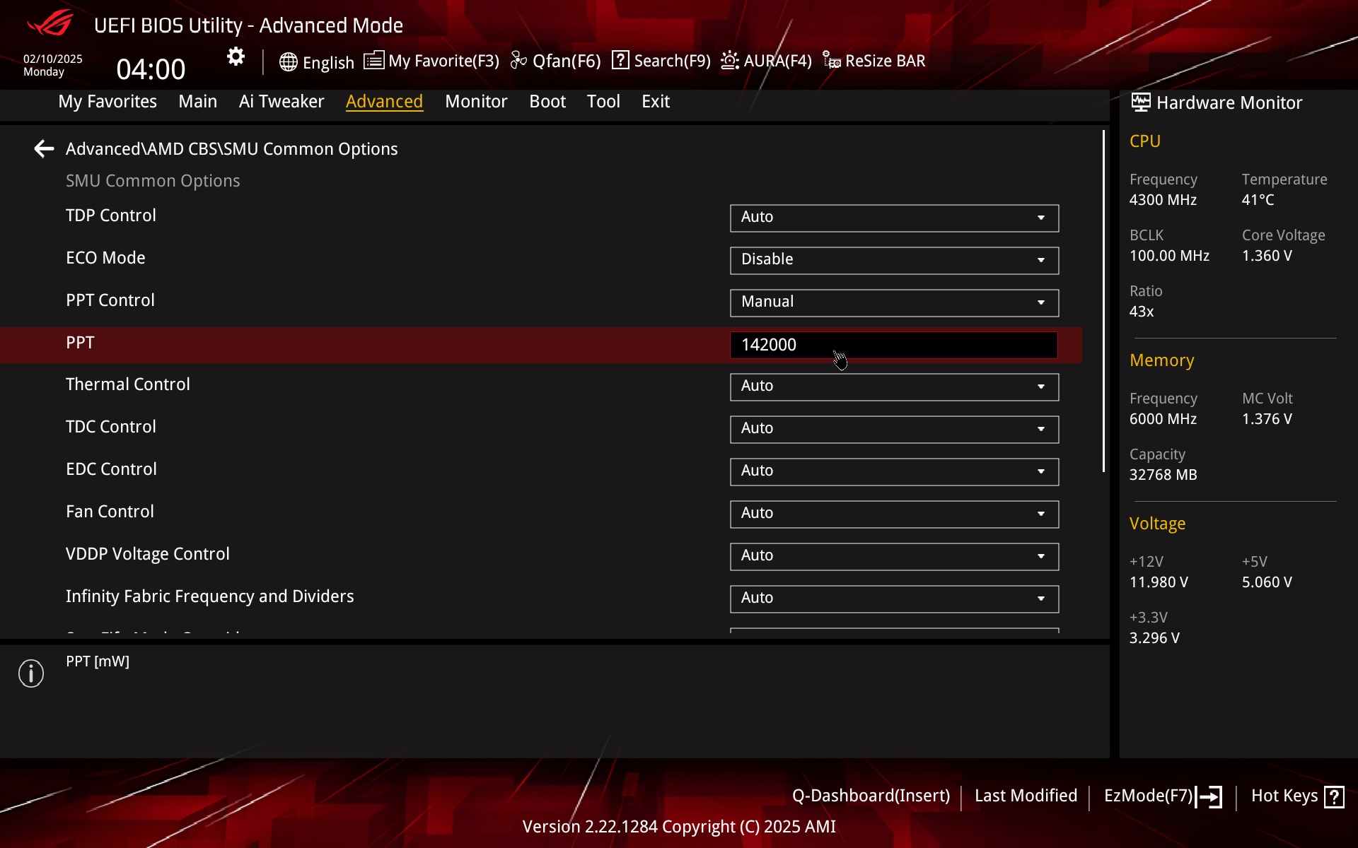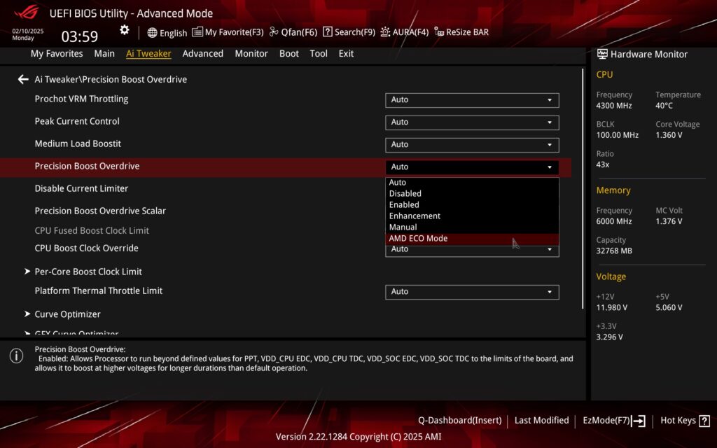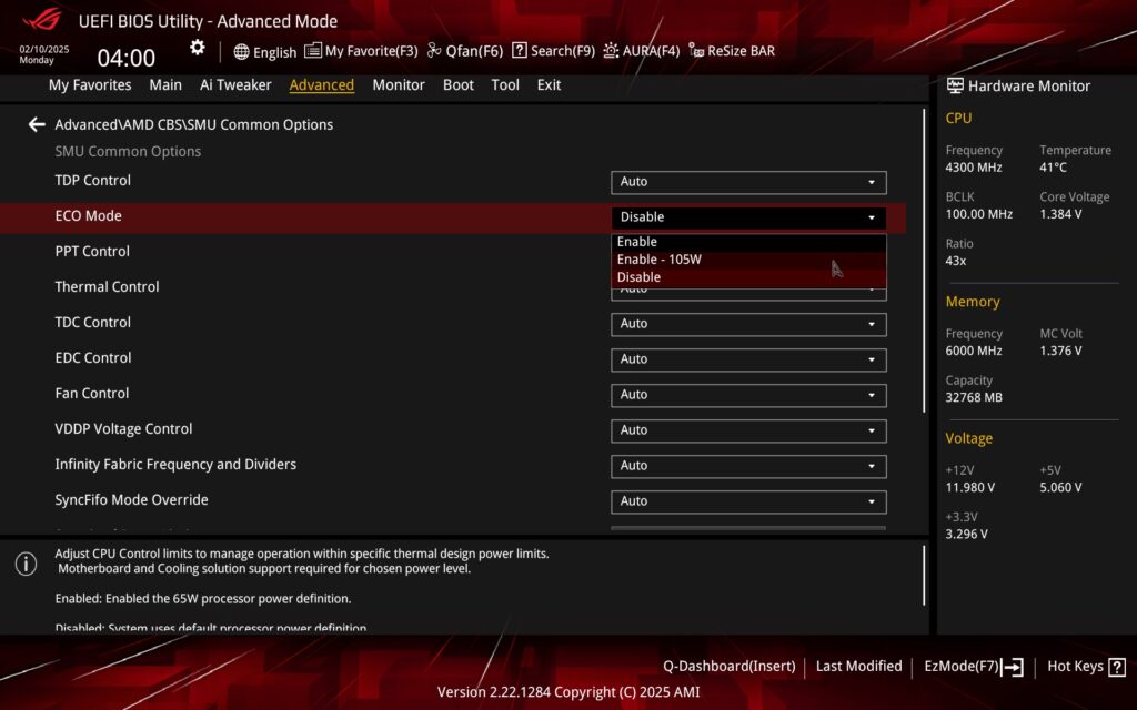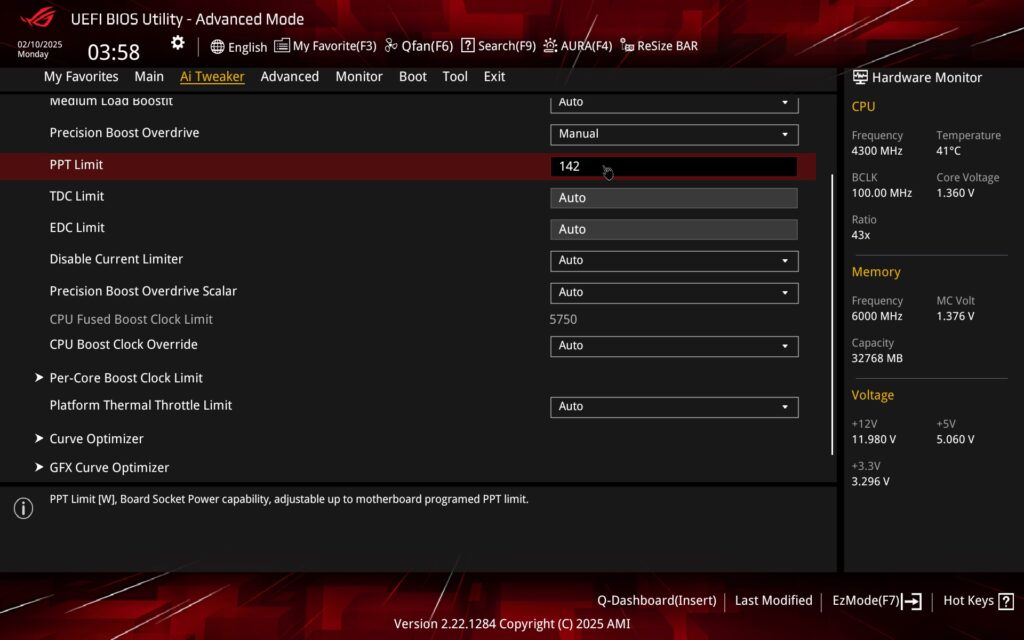 The way to adjust the power limits is for example via PBO on the Ai Tweaker tab by selecting manual mode and entering the exact numerical data. “142” = 142 W, so a TDP of 105 W. You can also set this (105-watt TDP) via enabling the Eco Mode preset profiles. For example, in the SMU Common Options section (Advanced\AMD CBS).