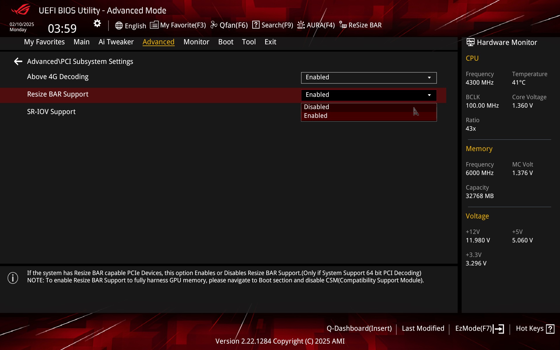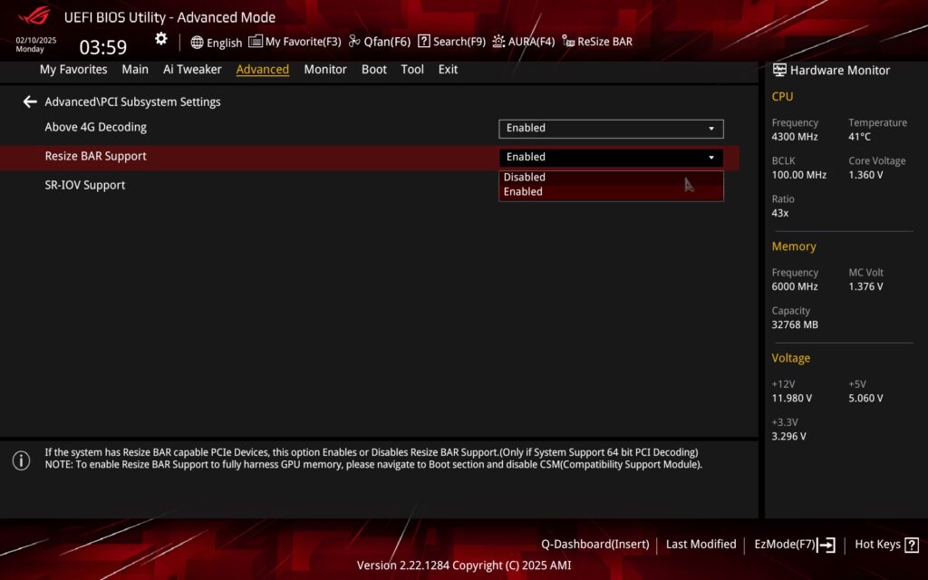 You can also disable or enable Resizable BAR in the advanced settings of the PCI subsystem. Or then in EZ Mode, Asus has a button for this in it for quick selection.