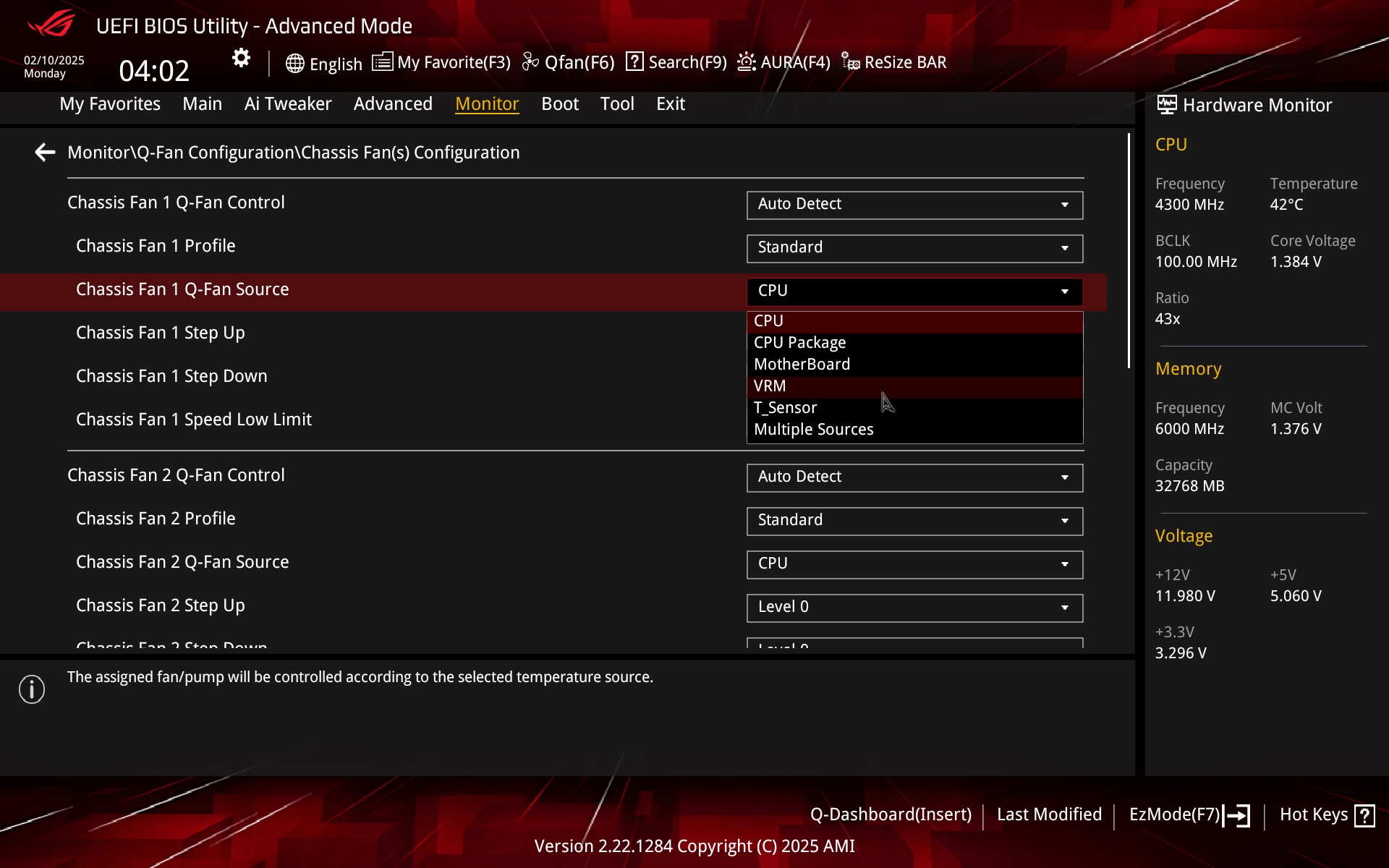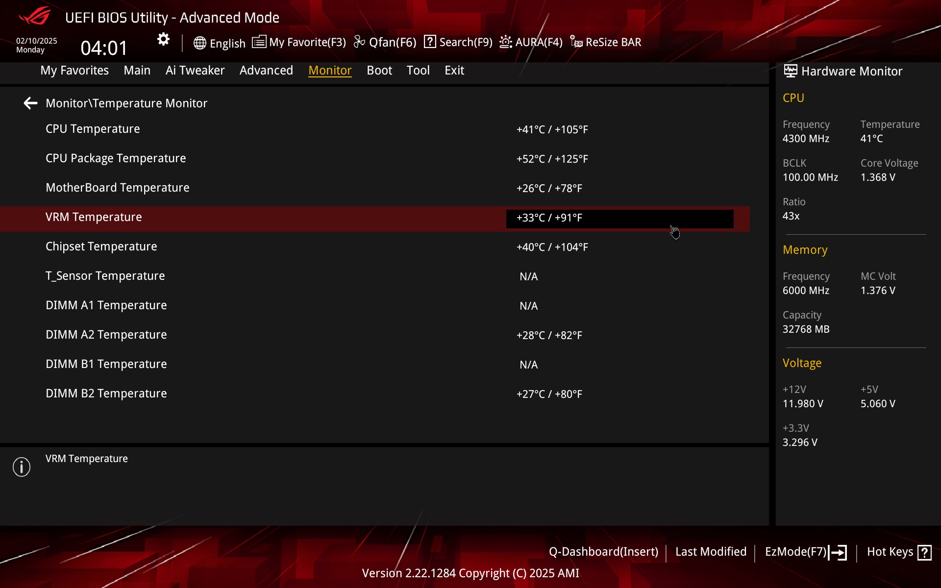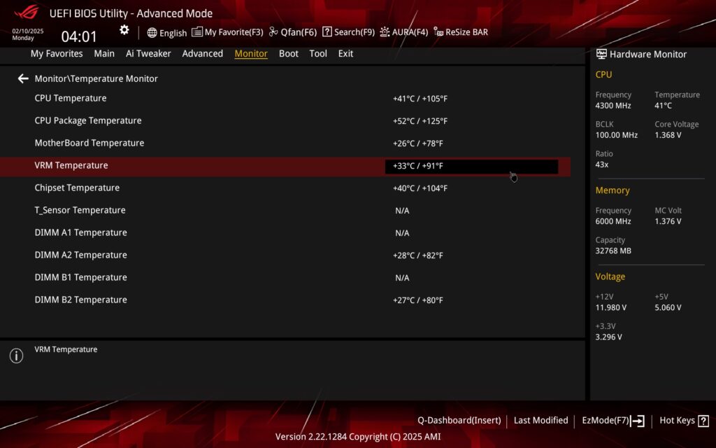 The Monitor tab contains several sensors and among others temperature sensors – CPU, CPU package, MB, VRM, chipset, or one optional (T_Sensor) requiring a thermocouple connection.