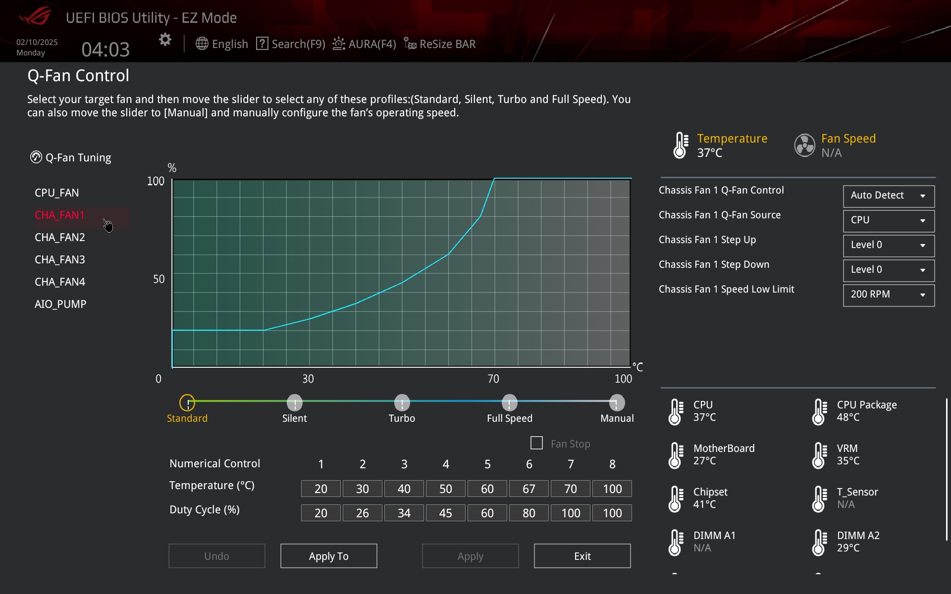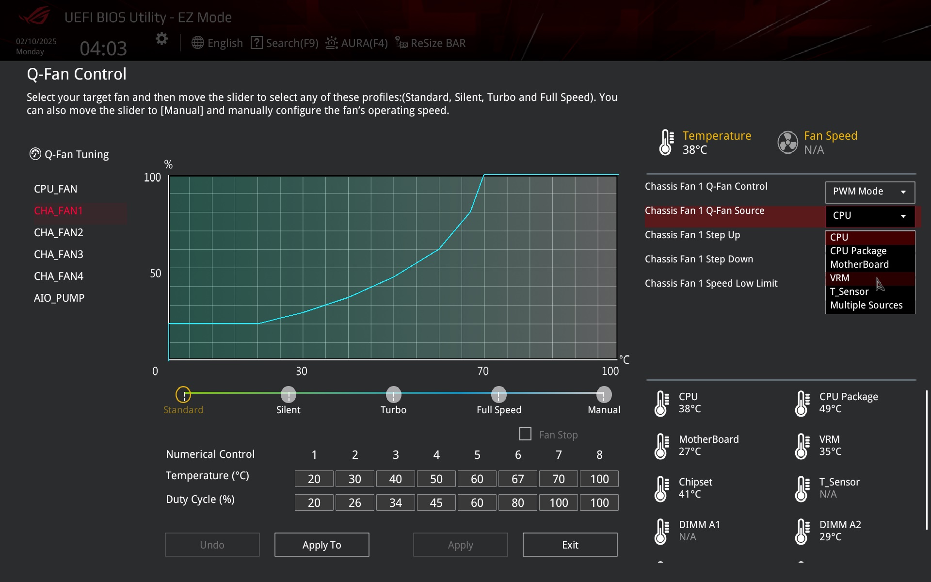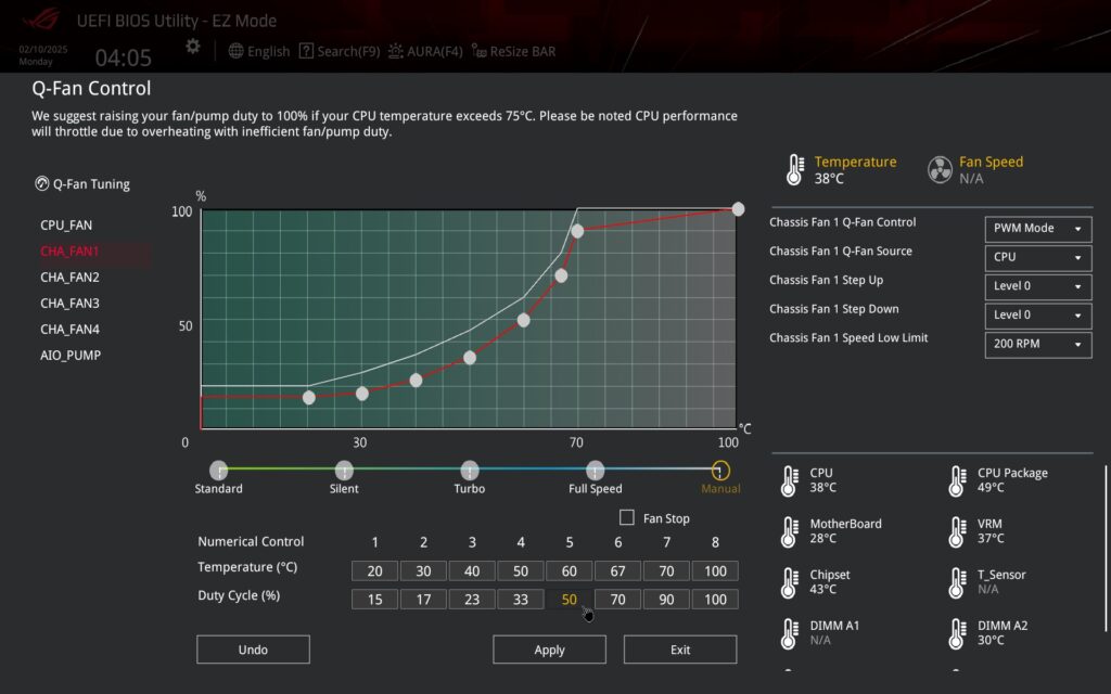 Also close at hand is the option to change the temperature source (once on another tab, outside of this screen) from which the control is to be based, and to adjust the curve there is already a two-dimensional table for entering the temperature and PWM values, or DC ( in the case of linear voltage fan control) in addition to the drag and drop technique.