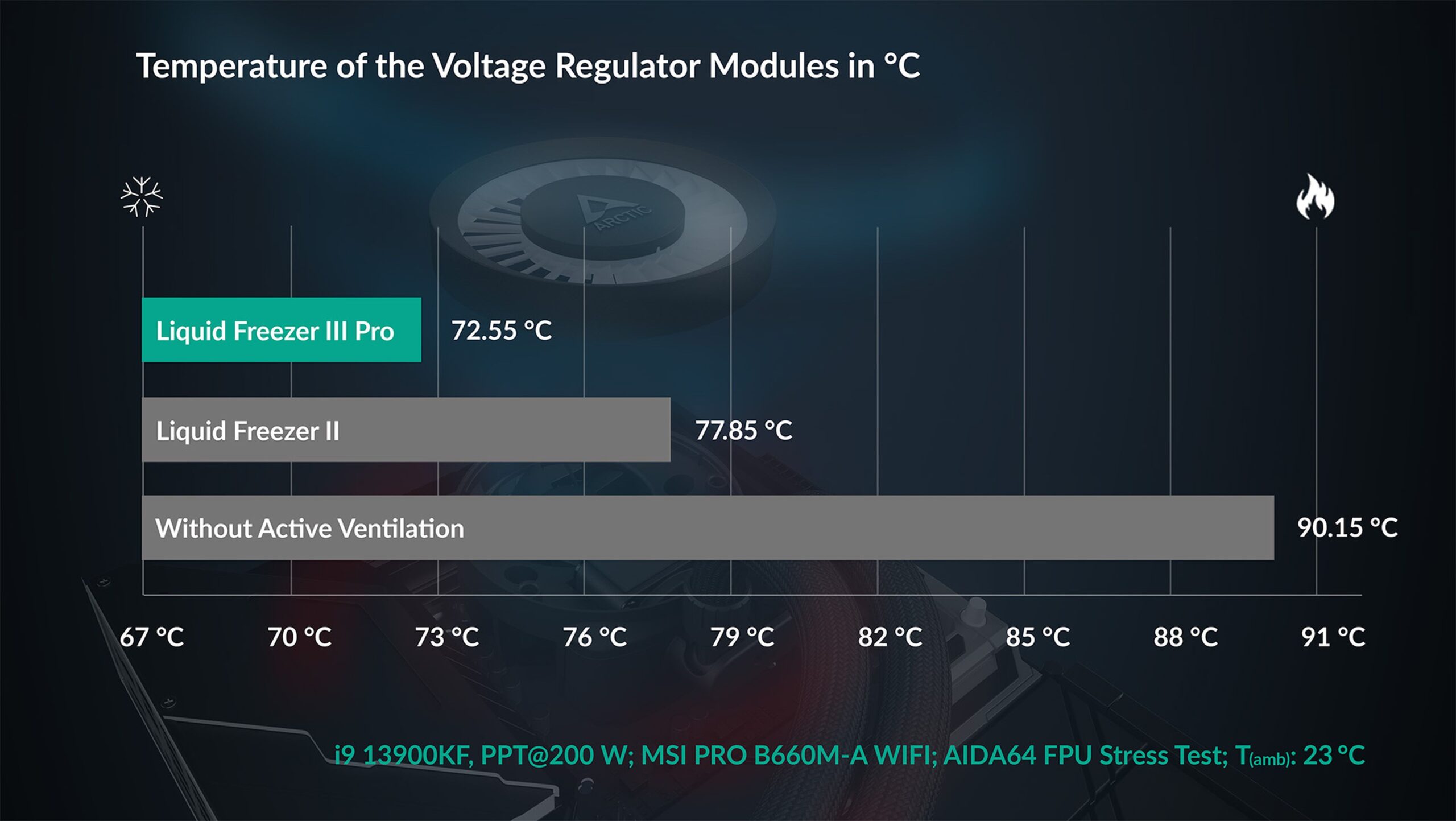 It’s not just the processor that benefits from effective cooling—the power delivery does too. That’s thanks to the small fan on the block cover, which ensures stronger airflow around the CPU socket area. Arctic’s internal tests show how the Liquid Freezer III Pro compares to the LF II or other AIOs that lack a fan on the block. We’ll take a closer look at this soon in our own testing. One Liquid Freezer III Pro (360) has already been in our test lab, ready for analysis.