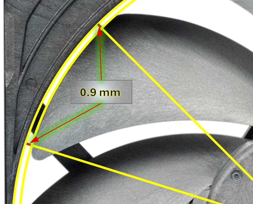 This dual-ring balancing solution may also relate to another feature Mr. Tenzin highlighted in the interview: the stated clearance between the blade edge and the inner fan frame is only 0.9 mm and remains consistent along the entire blade edge, not just between the blade-tip and the frame (where it matters most). Simply put, the blade edge and the frame are parallel and equidistant at every point.