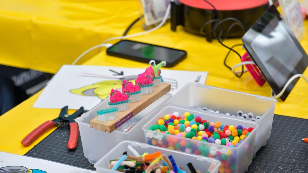 At the Wunderwuzzi Robots booth, Erkin Bayirli offered perhaps the simplest “tiny robot” that you can put together at home for a few pennies. And you could have bought and built it on the spot. The idea is trivial – you attach a vibrating motor and a button battery to a toothbrush with curved bristles. Once you start the motor, it starts to rattle and the robot starts bouncing forward against the direction of the bristles. You don’t even need a printed holder for the battery and motor, just a thermal adhesive will do. If you want something better and you have a 3D printer at home, just from one photo and the building instructions it’s obvious how a holder for the battery and motor works. And you can get the motor on Aliexpress for one euro including shipping.