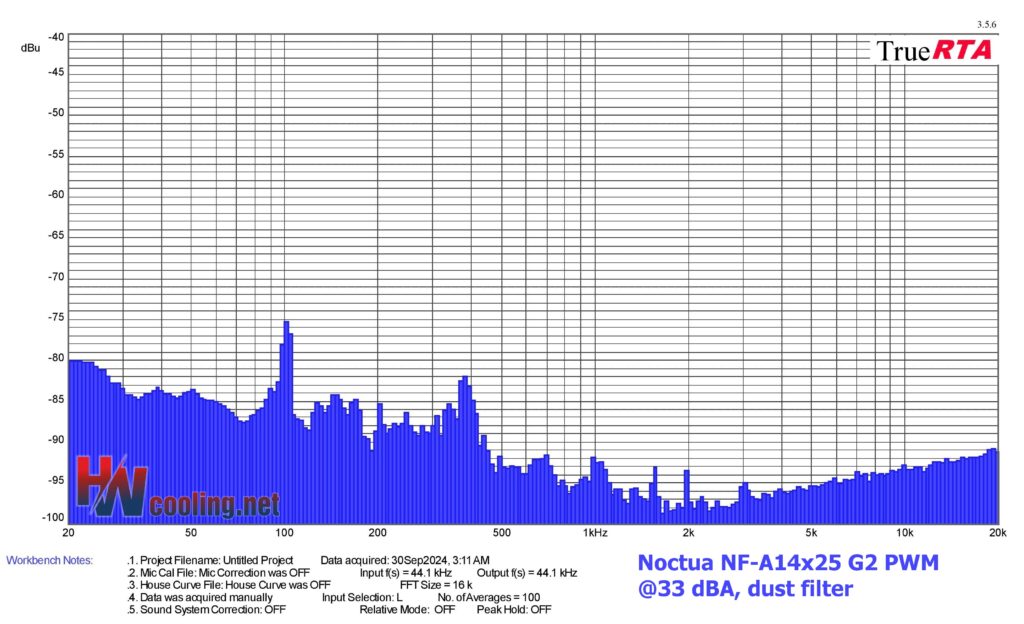 | Fan | Dominant sound freq. and noise level, dust filter@33 dBA | NF-F12 PWM | NF-A15 PWM | ||||