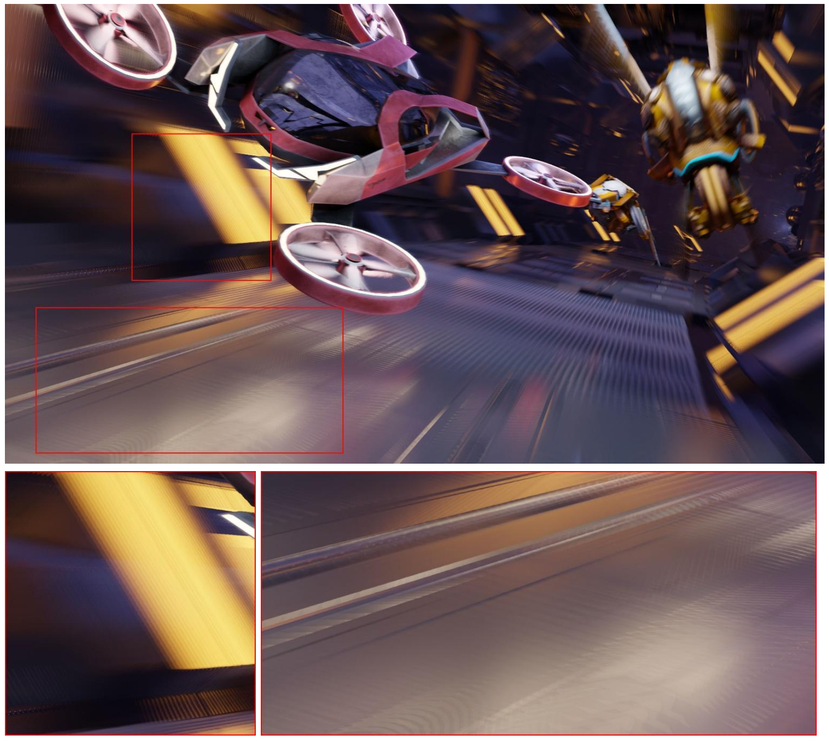 Akcelerace motion bluru na GPU NVIDIA otevírá možnost vykreslit tento efekt s plnou kvalitou a úrovní realistické simulace během samotného vykreslování scény. To je kvalitnější alternativa proti napodobení motion bluru pomocí běžně používaného postprocessingového vektorového efektu, který tvůrce aplikuje v samotné scéně.