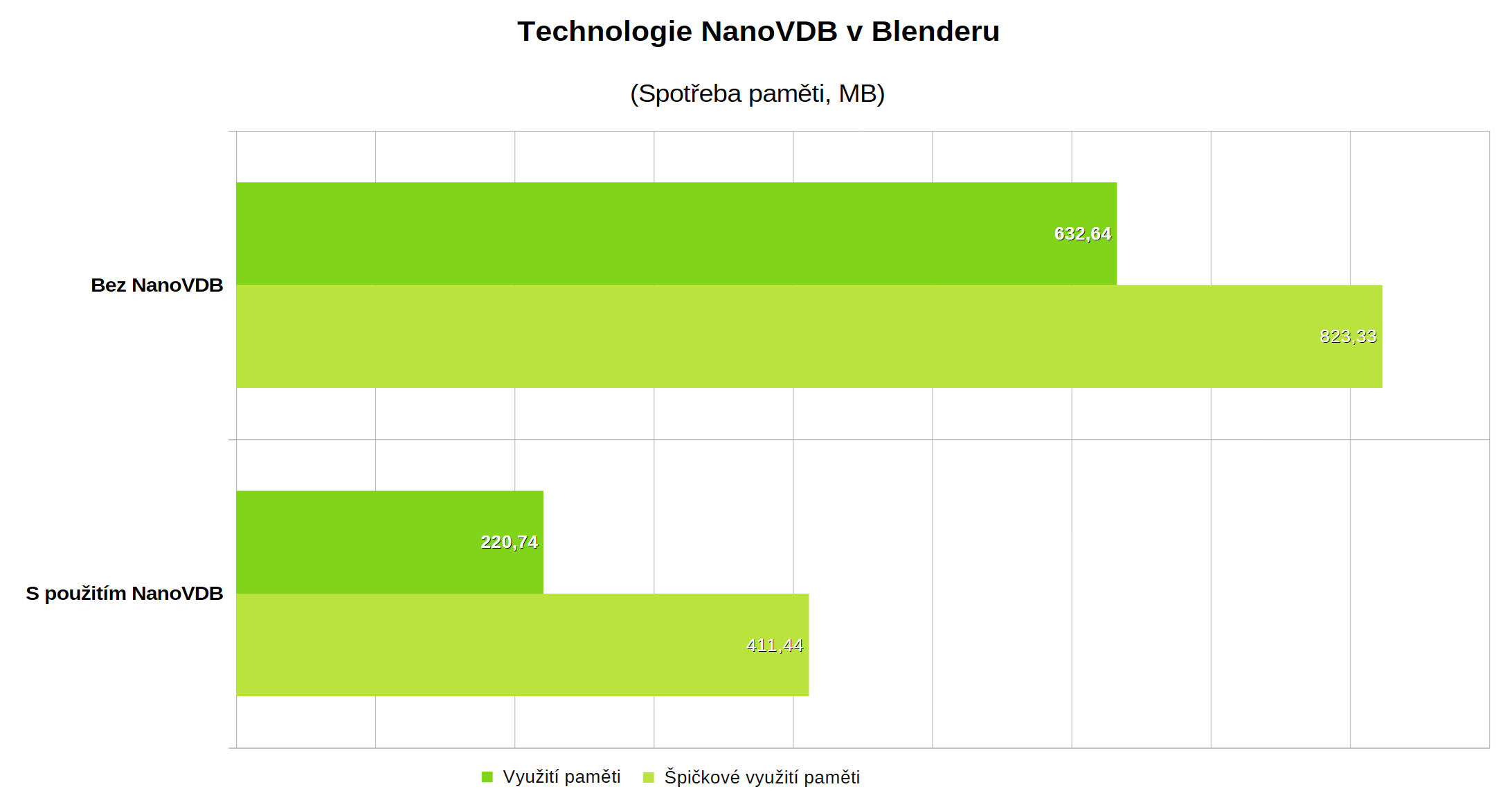 Grafika GeForce RTX řady 50 přinášejí možnost použít pro vykreslování volumetrických efektů technologii NanoVDB, která optimalizuje tyto techniky vykreslování pro běh na GPU. Klíčové je, že NanoVDB umožňuje provádět výpočty volumetrických efektů s až mnohonásobně menší spotřebou grafické paměti, která je omezeným zdrojem. Díky NanoVDB je tak možné zpracovat na GPU mnohem větší scény, zatímco bez této technologie jste nucení obětovat kvalitu scény a výstupu co do detailů a realističnosti. Přínosy NanoDVB jsou přitom tím větší, čím složitější a komplexnější volumetrické objekty a efekty scéna obsahuje.