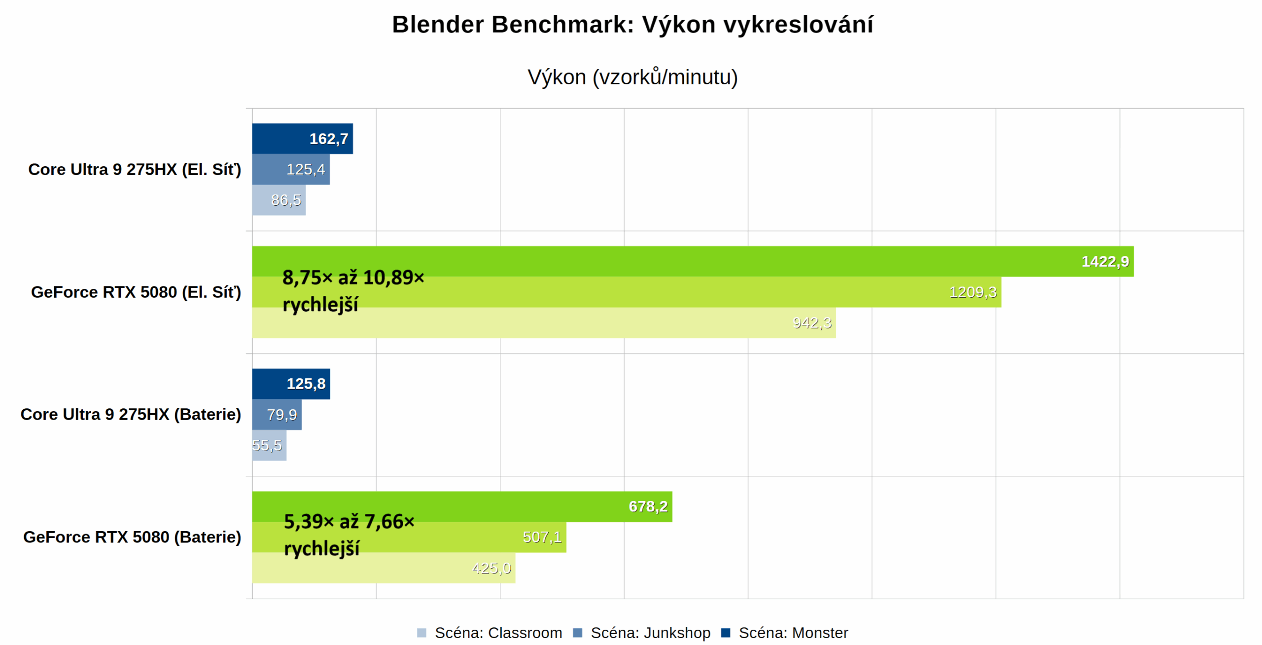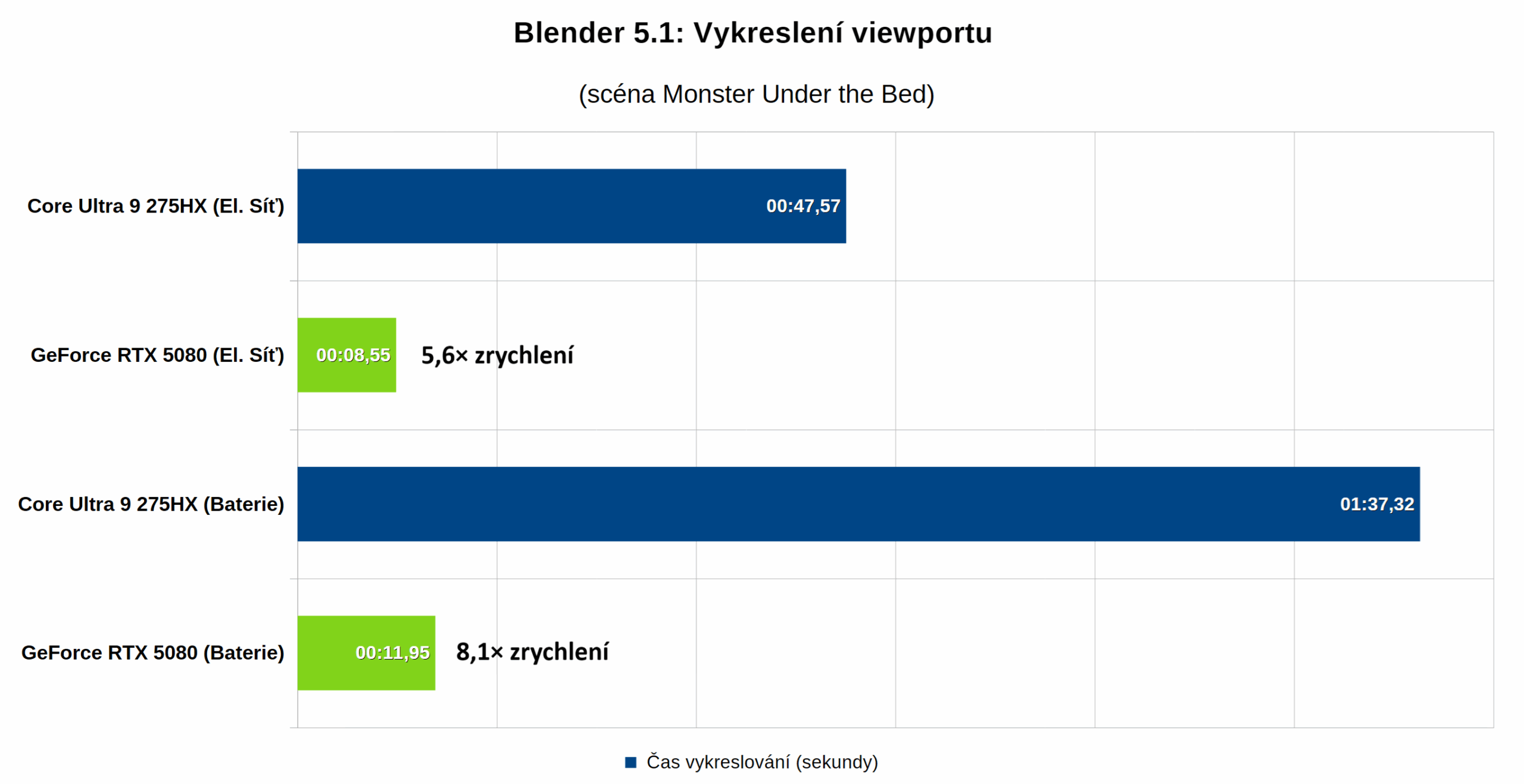 Jak lze vidět, využití výkonného GPU NVIDIA GeForce RTX 5080 dokáže výrazně zkrátit časy renderingu i proti výkonným highendovým procesorům, jako je Intel Core Ultra 9 275HX s 24 jádry, který je v notebooku Aorus Master 16 BYH osazený. I tak je proti němu rendering na GPU až 11× rychlejší.