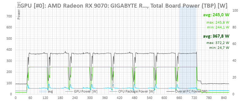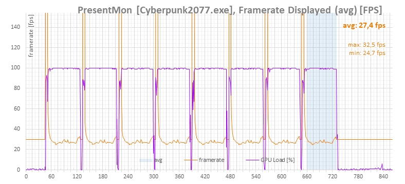 První sada měření je z benchmarku Cyberpunk 2077 s nastavením RT Medium v rozlišení 3840 × 2160 bodů. S tímto nastavením je grafický čip zatížený naplno. Jde o osm průběhů benchmarku hned za sebou.