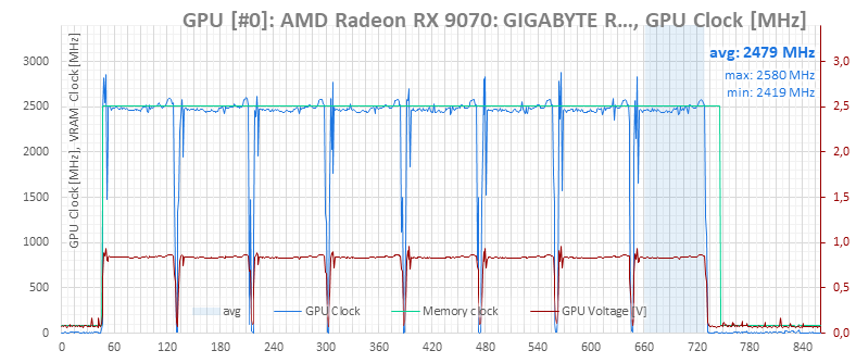 Takt grafického čipu se pohybuje mezi 2419 a 2580 MHz s průměrem na 2479 MHz. Proti 2461 MHz v režimu Silent je to jen minimální rozdíl, který se do výkonu propisuje v řádu desetin snímku za sekundu.