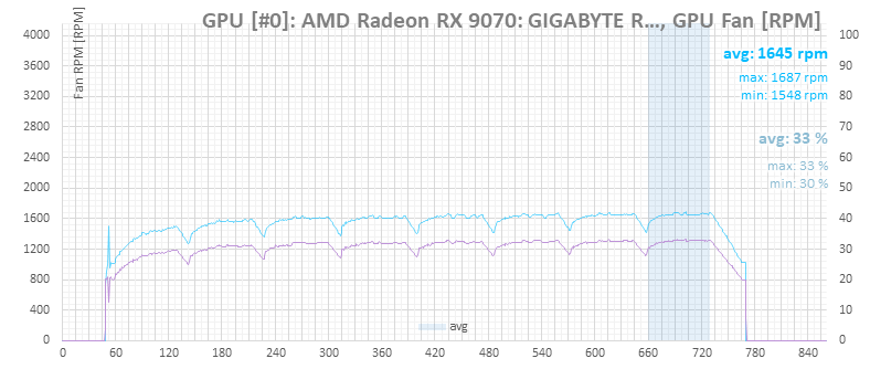 Karta je výrazně tišší než testovaný Radeon RX 9070 XT Gaming. V tichém režimu se i po delší zátěži dostávají drží pod 1500 ot./min a hodnota na hlukoměru se držela pod pod 35 dBA. Průměrná teplota čipu i tak zůstává výborná, o něco horší je to s teplotou hotspotu a pamětí.